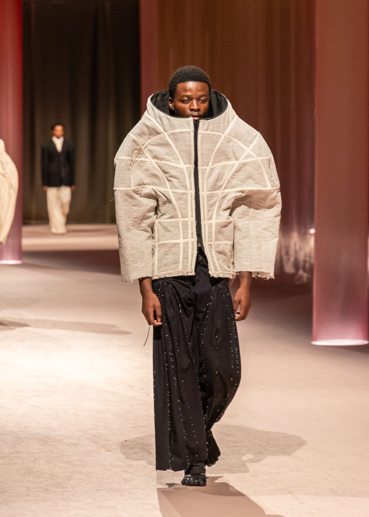 D’autres distinctions ont marqué le défilé. Ils ont récompensé l’émotion au travers de l’intangible: comme celui du Prix Bachelor Bongénie 2024 remis à Thibaut Barraud. Le couturier français a offert un moment d’une rare intensité avec sa collection Vivre avec… (2024). On y retiendra tout particulièrement la tenue noire, architecturale, laquelle a transcendé la fonctionnalité du vêtement pour devenir une allégorie des souvenirs brisés. Chaque élan de la tenue semblant évoquer tant un fardeau émotionnel qu’une tentative de libération. De même qu’Alan Clerc qui, primé pour [InProcess] (2024), a exploré la beauté de la création en devenir. Une veste blanche aux coutures apparentes, a à ce titre incarné l’instant fragile d’une idée qui prend forme. Il n’en fallait pas plus pour percuter dans l’œil du jury qui a remis au Genevois le prix de La Redoute et donc – comme son prédécesseur Jeremy Currat – la promesse d’une collection capsule à quatre mains avec la marque française.