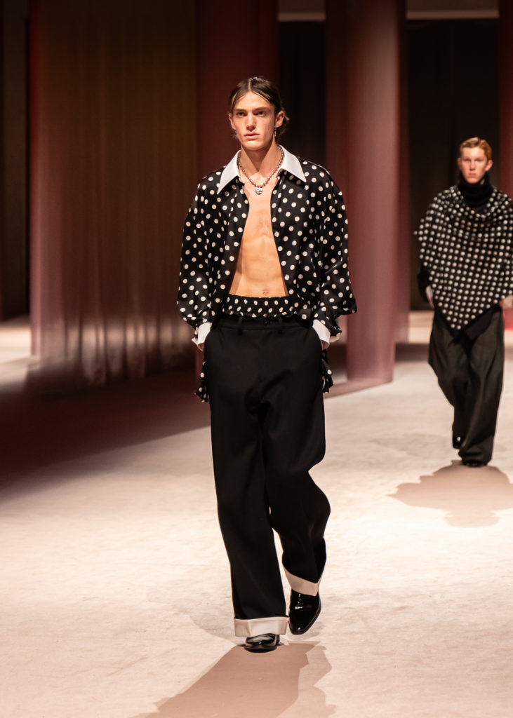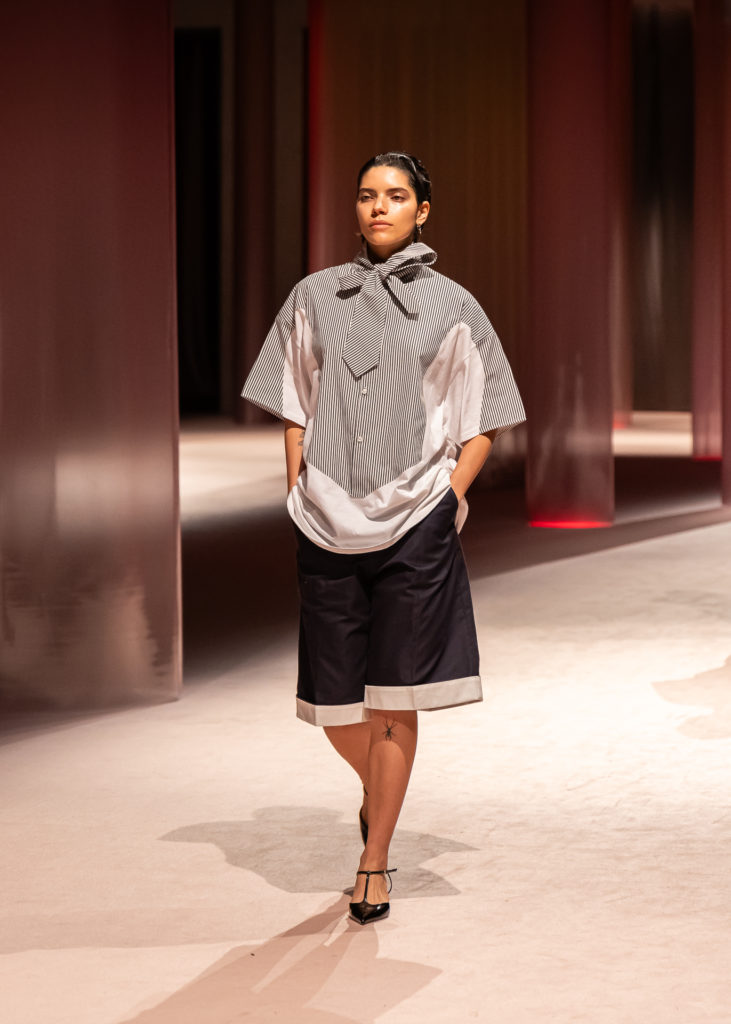 A commencer par Jeremy Currat, dont le savoir-faire lui a permis d’obtenir un rôle d’envergure: ouvrir le bal du défilé de la HEAD en tant qu’ancien étudiant. Une première. Avec Teenage Business (2024), le fondateur de la jeune marque Jeremiah a donné le ton: celui d’une génération qui se refuse aux cases et s’affirme dans l’entre-deux. Prolongement de sa collection avec La Redoute, son vestiaire a, ici, encore mieux redéfini les codes de l’élégance entre cols doublés, ballerines portées par la gente masculine et cravates/foulards. Dans le même temps, les matières répondaient à des coupes chirurgicales, dessinant une adolescence en équilibre entre apathie et revendication. C’est l’histoire en somme d’un créateur, tout droit sorti de Genève et son ouverture au monde, qui délivre à chaque collection, un art convainquant toujours mieux les passionné.e.s de la classe intemporelle.