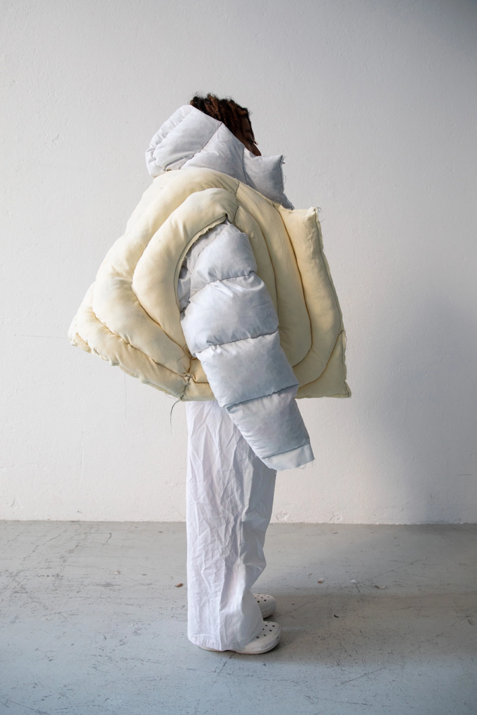 281 millions de personnes ont quitté leur pays en 2023, si l’on en croit le dernier rapport de l’Organisation internationale pour les migrations (IOM). « Un record », étaye l’IOM, qui a résonné comme un appel pour Elias Al-Ameri. Il l’affirme lui-même : depuis Zurich, le photographe de mode a alors temporairement troqué son objectif contre l’aiguille, afin de mieux « attirer l’attention » sur la situation. En est née Vanishing Point (2021-2022), une collection confectionnée à partir de matériaux récupérés sur les plages de Lesbos main dans la main avec Mushreq Jabbar, un réfugié rencontré durant son voyage sur l’île grecque, ainsi que la designer zurichoise Naïma Naas. Sur la Toile, celui désormais nominé aux Prix suisses du design 2025 revendique une volonté claire : ne travailler qu’avec des matériaux porteurs d’un passé, pour une mode-récit viscéralement humaine et résolument résistante.