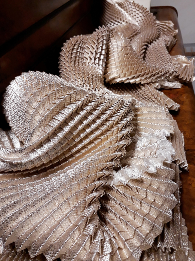 Ses créations captivent comme un sortilège. La spécialité d’Eva Ott : explorer les possibilités infinies du plissage, technique que la Bâloise estime encore trop peu célébrée, quand bien même elle irrigue en silence les veines les plus profondes du design de mode. A travers son studio Plisseebrennerei Textilatelier, cette enseignante, qui justifie de plus de vingt ans d’expérience dans la mode et le théâtre, redonne vie à un savoir-faire ancestral. Un hommage maîtrisé qui n’a pas échappé à la Confédération qui l’a naturellement fait figurer parmi les nommés des Prix suisses du design 2025.