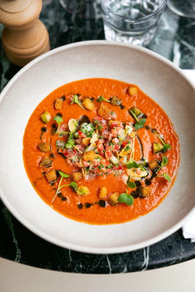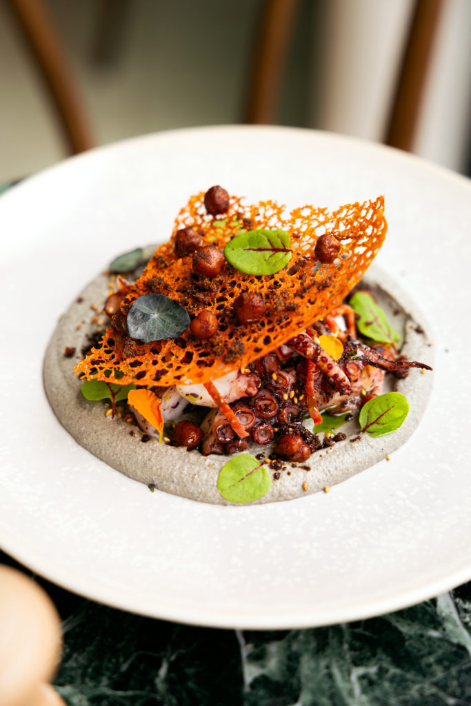 Autre démonstration d’intelligence culinaire : la salade de poulpe, houmous au sésame, pois chiches torréfiés aux épices et chorizo grillé. Le jeu des textures et des températures y est souverain. Les éléments rôtis apportent chaleur et relief, tandis que la fraîcheur du houmous, subtilement relevée, vient contrebalancer la puissance du chorizo. Chaque ingrédient a sa place, aucun ne domine.