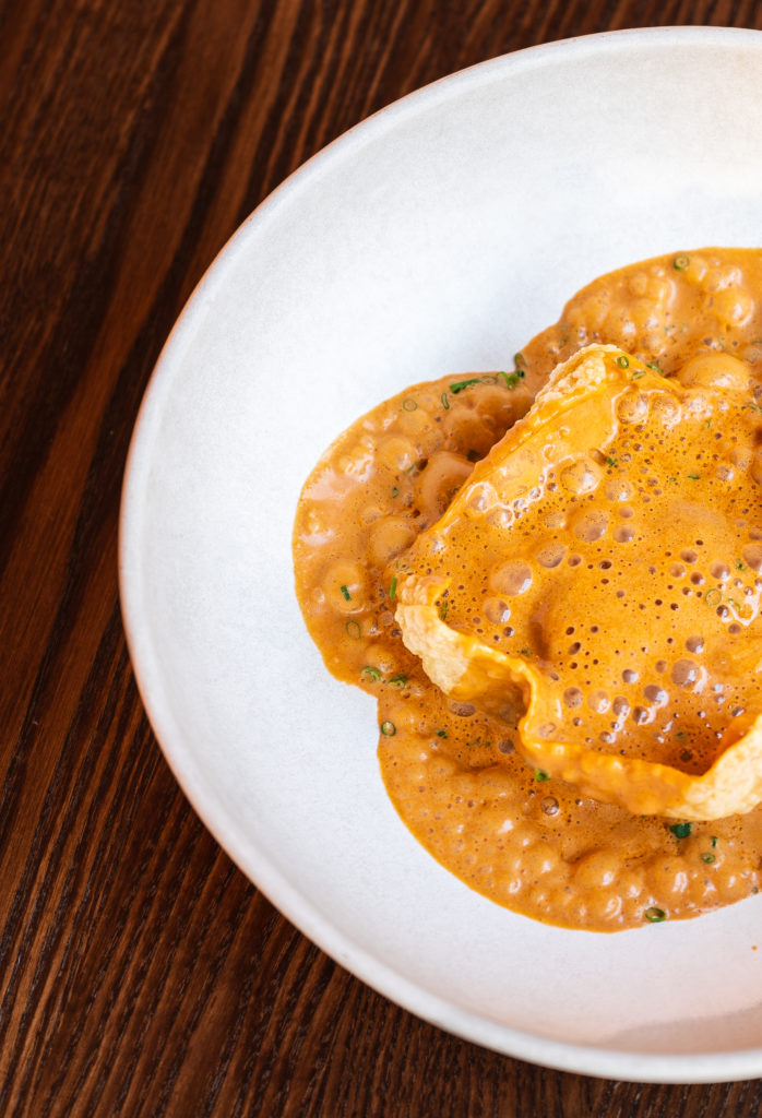 Des plats qui témoignent de cette approche, citons en premier lieu la raviole croustillante de langoustine. Une entrée qui traduit parfaitement la signature du restaurant français. Posée sur une émulsion de crustacés intensément parfumée, elle séduit d’abord par une présentation d’une délicatesse graphique, toute de bulles orangées. La pâte, fine et dorée, délivre un croustillant précis, contrastant avec la langoustine à la cuisson parfaite, dont la chair fond avec douceur. L’émulsion, aérienne enveloppe alors le tout avec un côté iodé maîtrisé, jamais écrasant. Equilibre remarquable.