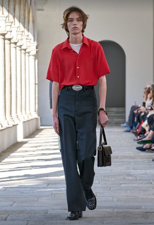 Chemise à manches courtes rouge écarlate, pantalon noir impeccablement coupé effleurant juste ce qu’il faut la ligne de souliers en cuir clouté. Samedi 26 avril, Penn Badgley a fait sensation dans cette allure nette, presque en résonnance avec l’aura finement ciselée de Joe Goldberg, le personnage énigmatique qui façonne sa carrière depuis 2018. Sous une simplicité pleine d’élégance, la tenue du célèbre acteur américain a été choisie par le styliste du moment Fabio Immediato, afin de l’accompagner dans la tournée presse du lancement de la cinquième saison du thriller à succès. Et le premier réjoui était Bally, créateur de ce look.