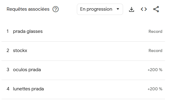 Si Prada domine le classement suisse, c’est notamment grâce à un accessoire phare : les lunettes. Selon Google Trends, les requêtes les plus populaires associées à la marque dans le pays sont « lunettes Prada » (en anglais, en portugais et en français), signe d’un engouement particulier pour l’optique haut de gamme, plutôt que pour les vêtements ou les sacs de la maison.