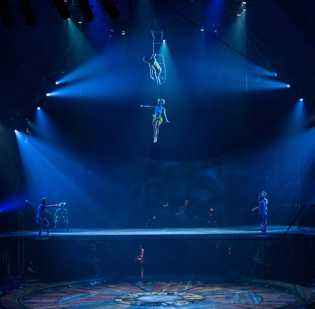 En toile de fond de cette conversation, des artistes à la musculature saillante, ou plus frêle, des athlètes mais aussi des circassiens traditionnels. Ils répètent un numéro d’équilibristes, une pyramide humaine se forme et se défait sous nos yeux avec une facilité déconcertante. « 1h30 d’entraînement par jour, pour s’améliorer ou se corriger ». Benjamin Anikine fait partie des acrobates du cirque depuis trois ans. Il a 29 ans, et est originaire de Carpentras. « J’ai vu le Cirque du soleil lorsque j’avais 10 ans, je me souviens que j’ai dit à ma mère : un jour je ferai partie de cette troupe ! » Une promesse et rêve de gosse réalisé pour ce gymnaste, qui malgré une parfaite conjugaison de son art, a bien les pieds sur terre ! « Ce n’est pas donné à tout le monde d’entrer dans la troupe. Il faut des conditions physiques particulières et une bonne base athlétique pour tenir un rythme soutenu : entre huit et dix shows par semaine, et jusqu’à trois par jour ». Dans son numéro, cinq autres acrobates performent avec lui sur un immense filet. Leurs mouvements de jambes modulent l’amplitude des rebonds, les projetant par moments jusqu’au sommet du chapiteau ! Un élan collectif, comme une partition à plusieurs mains, animée par l’envie de donner du plaisir des spectateurs.