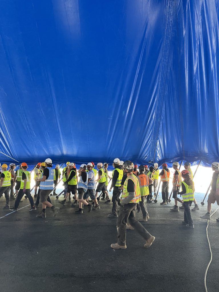 Vendredi 16 mai 2025, 12h45 plaine de Plainpalais. Nous étions une poignée de privilégiés réunis pour assister à la dernière étape d’un lever de chapiteau particulier, celui du célèbre Cirque du Soleil. Ce jour-là, la place a encore des airs de chantier, des tentes pleines de matériel, des tubes immenses, des engins en tous genres campent l’endroit au milieu du bitume recouvert de sable, qui dans un élan de grand vent se mêle à l’atmosphère.