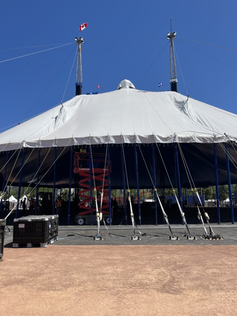 David Constantineau, directeur du site, nous explique que la cinquantaine de personnes qui constitue l’équipe technique travaille déjà sur place depuis 3 semaines environ. « Le montage du chapiteau de 19 mètres de hauteur, qui accueillera 2500 personnes, dure 7 jours ». Une installation grandiose qui ne s’envisage pas à la légère. « Il faut d’abord s’assurer que l’endroit peut accueillir une structure comme celle-ci, puis un sol est coulé spécialement pour recevoir le chapiteau de 51 mètres de diamètre, dont la toile pèse 7 tonnes, 1200 encrages d’1m20 de profondeur chacun sont plantés dans le sol… ».