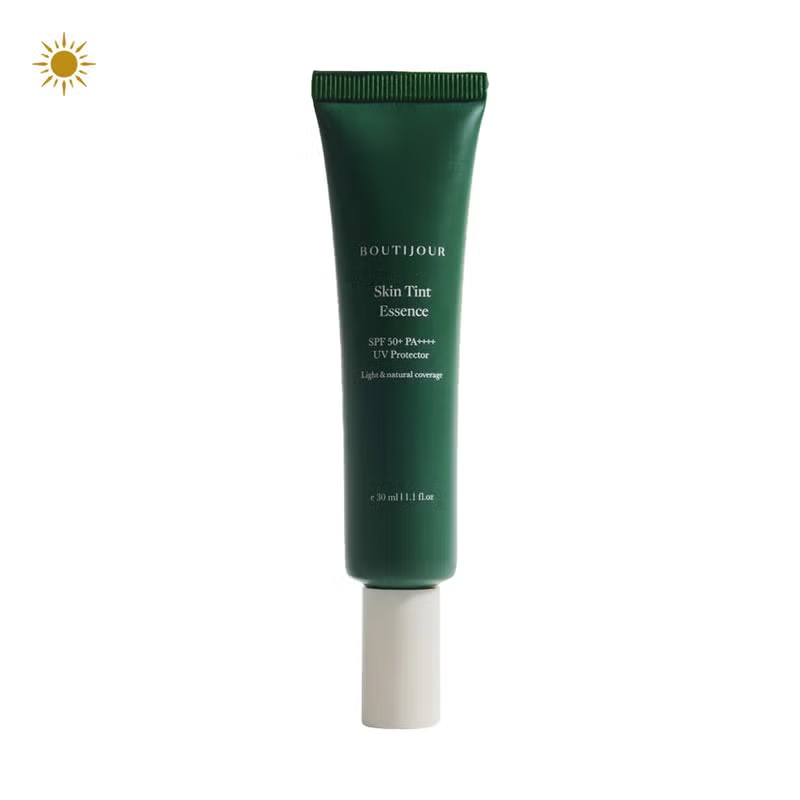 Vous cherchez une crème solaire teintée ? Laissez-vous séduire par l’Essence Teintée de Boutijour, une lotion délicatement parfumée à la texture légère qui allie protection solaire et soin de la peau. Dotée d’un SPF 50+ et d’un PA++++, elle combine filtres chimiques et minéraux pour une défense optimale. Sa formule apaisante et hydratante contient de l’eau de lotus, du panthénol, de l’oxyde de zinc, de l’extrait de fleur de grenade et du bisabolol, pour un teint unifié, frais et naturellement lumineux.