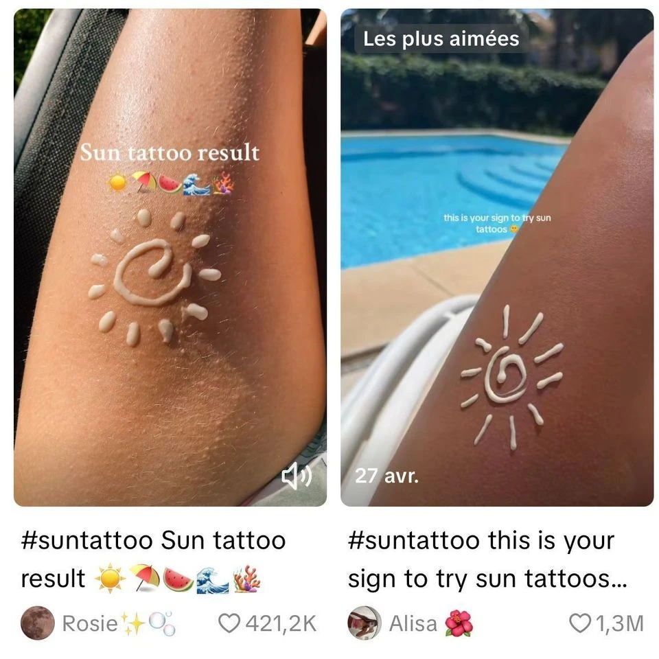 Mais cet été, une nouvelle pratique s’impose : le « sun tattoo », ou tatouage solaire. Le principe est simple : appliquer de la crème solaire en forme de motif – cœur, soleil, fleur – à l’aide d’un pinceau ou à main levée, puis s’exposer au soleil en espérant que la peau bronzera partout… sauf sur les zones protégées. Résultat : un contraste qui donne l’illusion d’un tatouage, le tout sans encre ni aiguille.