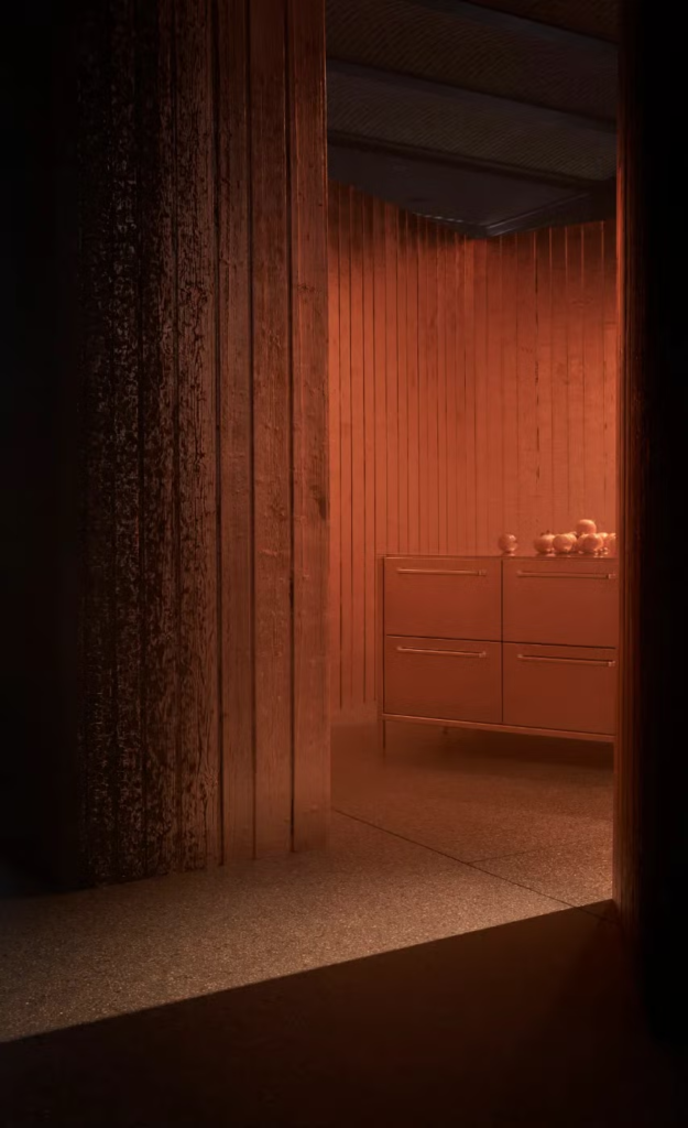 Lors d’une présentation marquante aux Three Days of Design, Vipp s’est associé au Studio KO pour dévoiler une installation sculpturale : une maison d’hôtes éphémère nichée dans un garage reconverti derrière le siège de Vipp. Ce lieu joue sur les contrastes : un bois brûlé aux feuilles de cuivre enveloppe une cuisine Vipp revêtue de cuivre, rendant hommage au feu et au rituel partagé de la cuisine.