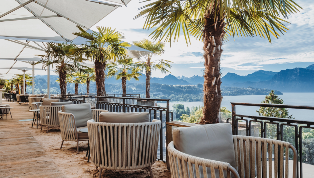 Ce n’est pas tout à fait la Côte d’Azur, et c’est peut-être mieux : moins de monde, plus de charme. Palmiers, coussins moelleux, parasols en toile blanche : ici, sur les hauteurs de Lucerne, le Montana Beach Club de l’hôtel Montana distille une atmosphère méditerranéenne à faire oublier la latitude. Le rituel préféré des estivaliers ? Un spritz bien frais, un bol d’olives, et cette vue à couper le souffle sur le lac des Quatre-Cantons, encadré par les sommets. Et pour s’immerger dans une ambiance d’autant plus Croisette, un dress code est recommandé : « smart casual », parfait équilibre entre chic et confort. Un lieu suspendu, entre élégance estivale et décontraction assumée, où l’on vient s’attarder jusqu’au dimanche 28 septembre.