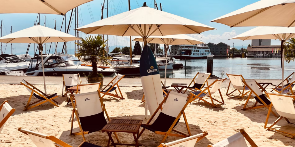 A Bâle, l’été prend quotidiennement des allures de carte postale. Beachtown, c’est ce lieu caméléon où la ville se transforme en station balnéaire, sans quitter les rives du Rhin. Transats immaculés, mobilier blanc, sable chaud : le décor est planté, entre vibes boho chic et élégance urbaine. Dès midi et jusqu’à minuit, on y sirote un verre, on grignote face au lac, bercé·e par une playlist qui glisse doucement vers la nuit. Et quand le soleil décline, les lumières se tamisent, et l’ambiance devient presque cinématographique.