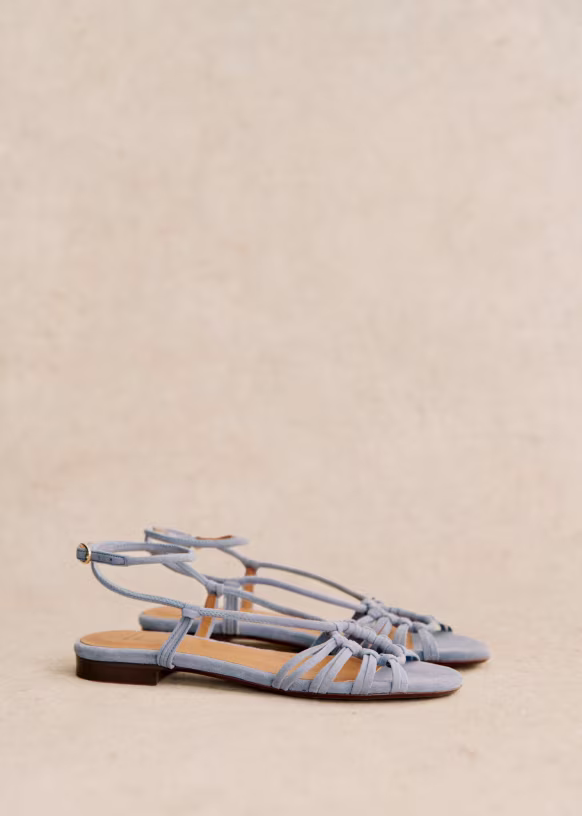 Avec leurs fines brides qui soulignent délicatement la cheville, ces sandales sont un grand classique intemporel. Ce printemps-été, on craque tout particulièrement pour le modèle en suéde bleu ciel signées Sézane, parfait avec une robe longue minimaliste.