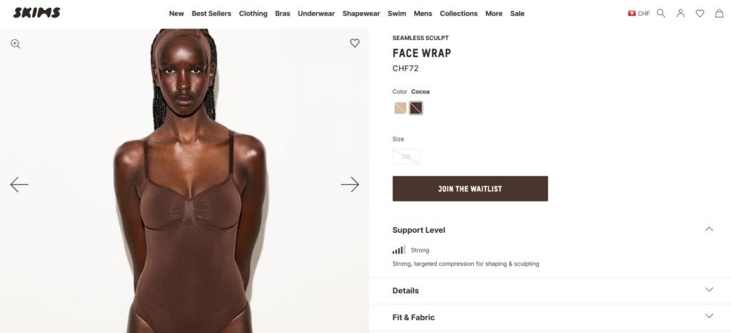 Dévoilé le 29 juillet sur le site de Skims, le « Seamless Sculpt Face Wrap » se présente comme un accessoire de beauté nocturne, conçu pour offrir un soutien ferme à la mâchoire et améliorer l’ovale du visage pendant le sommeil. Proposé au prix de CHF 72.-, il est doté de fermetures réglables à l’arrière du crâne et sous le menton, le tout dans un tissu sculptant enrichi – selon Skims – de « fibres de collagène ».