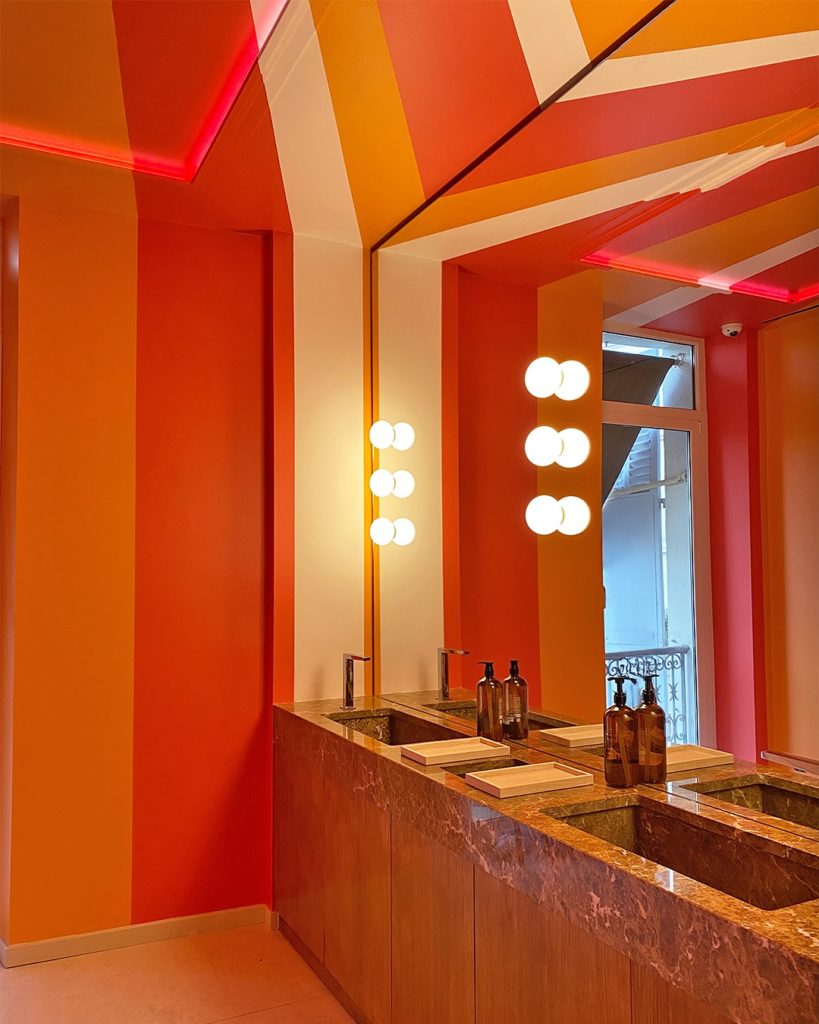 Une esthétique rétro-chic, qui plonge dans les années 1960 et 1970 de Patty Pravo, muse de la Dolce Vita. Son tube La Bambola (1970) – la poupée en français – inspire bien plus que le nom du restaurant. Il insuffle à l’ensemble une douceur réjouissante oscillant constamment du glamour vintage à la décontraction parfaitement maîtrisée. Les banquettes aux rayures caramel et lilas, les chaises en velours vieux rose et acier chromé, le sol en terrazzo multicolore. Tout évoque les villas méditerranéennes d’antan, tandis que les luminaires sphériques suspendus diffusent une lumière chaude, feutrée, presque cinématographique.
