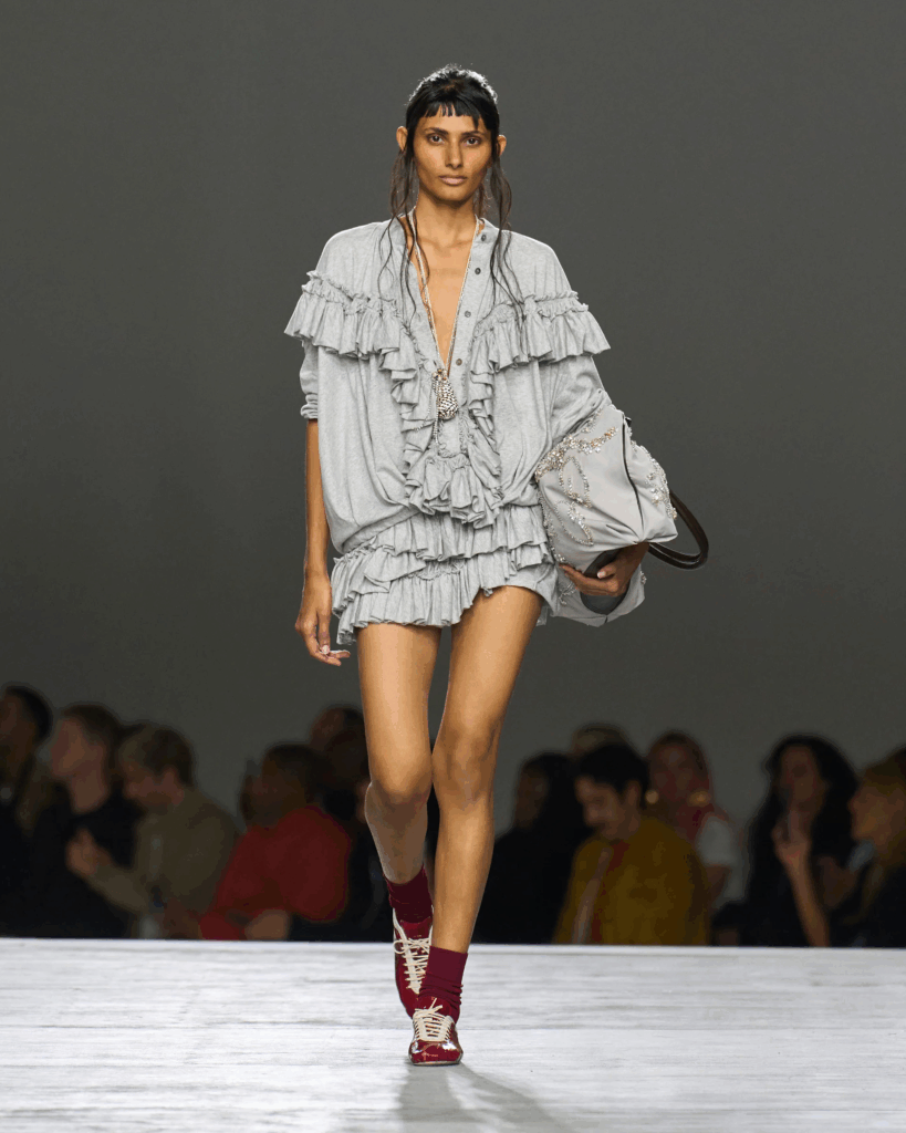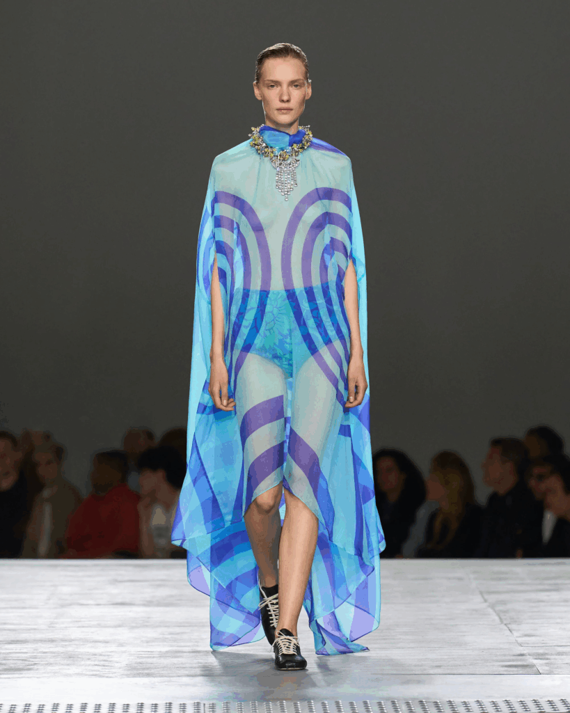 Le directeur artistique élu en poste en décembre dernier a réussi l’exercice périlleux d’une transition sans trahison. Dans la majorité des looks, on apprécie grandement le raffinement des broderies, la construction quasi architecturale des hauts, qui trouvent régulièrement des contrepoints dans la légèreté du bas. Ce jeu entre structure et mouvement, rigueur et souplesse, donne à la collection printemps-été 2026 de Dries Van Noten une confiante modernité.