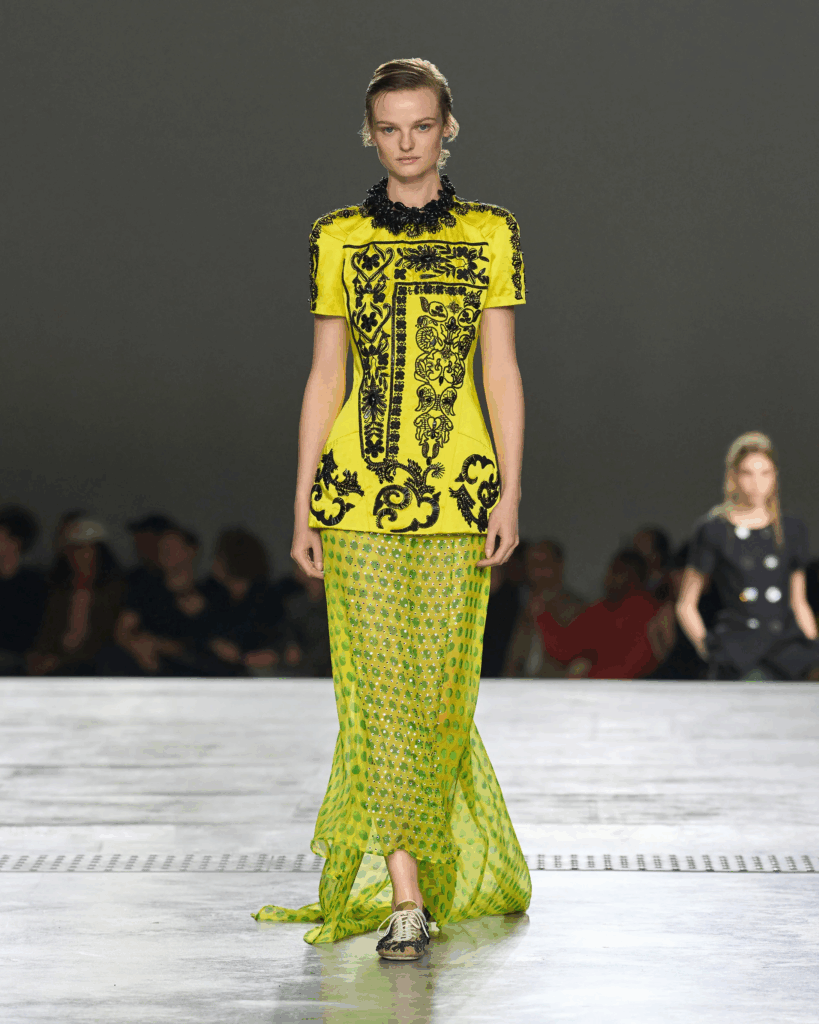 Les premières silhouettes surgissent comme une saison estivale des plus réjouissantes durant cette Fashion Week parisienne nuageuse. En ce mardi 30 septembre, au Palais de Tokyo, Julian Klausner impose sa première vision d’un été féminin selon Dries Van Noten : un été où la lumière se superpose, se brode. Ce look – top jaune canari orné de broderies noires et jupe fluide vert acide – résume à lui seul la partition chromatique et stylistique du défilé. Audacieux, détonnant, presque sonore. On y retrouve tout l’esprit de la maison belge : le sens du motif, la science du contraste, le goût du détail. Mais le styliste américain, sans renier cet héritage, déplace le curseur. Il allège, il fluidifie, il insuffle avec évidence un vent nouveau.