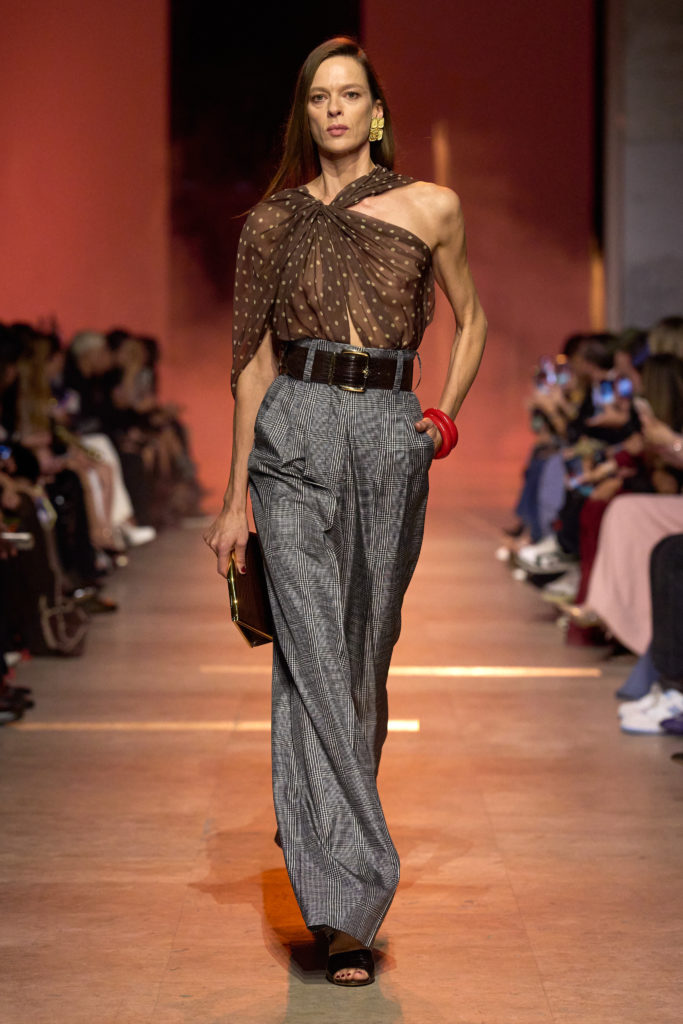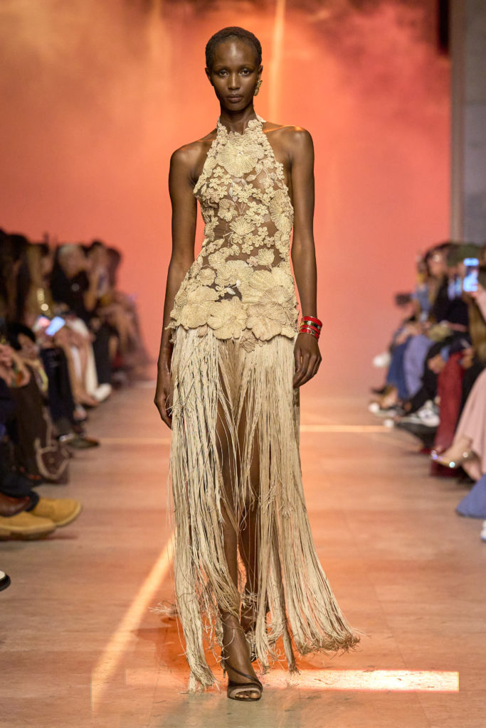 Après plus de quarante ans de carrière, on pourrait pourtant croire qu’Elie Saab a tout dit de la thématique de la nature. Il parvient pourtant comme sans difficulté à réinventer. Ici, pas d’hommage attendu, pas de redite, encore moins de faciles hautes volées. Juste une déclaration d’amour et sincère à la nature – oui – mais la nature féminine moderne. Celle qui impose sa présence sans crier, qui joue, qui attire, qui conquiert sans forcer. Et l’on sort de ce défilé avec l’impression fugace, mais persistante, d’avoir entrevu quelque chose de satisfaisant : une vision du féminin tout simplement marquante.
