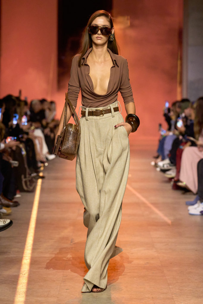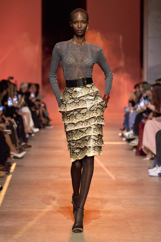 Le tailoring est sculptural. Mais les tissus s’écoulent avec une légèreté inattendue. Les brocarts scintillent de bronze, les robes se parent de franges ombrées qui captent la lumière, les co-ords minimalistes s’associent à des plateformes audacieuses. Les couleurs – nude, umber, safran, pierre – évoquent des trésors et chaque imprimé, chaque motif de python, semble murmurer : « oses, surprends, séduis ».