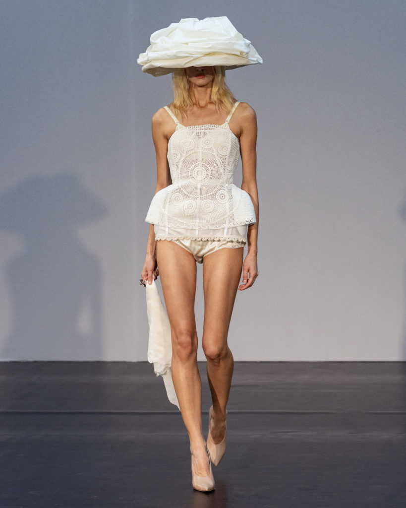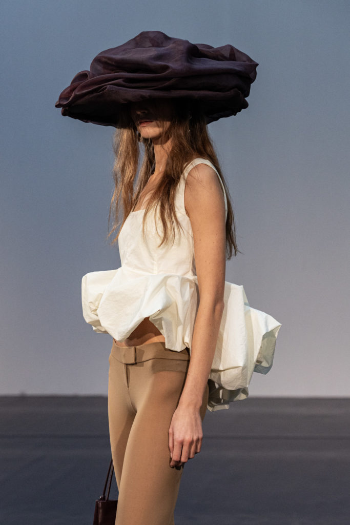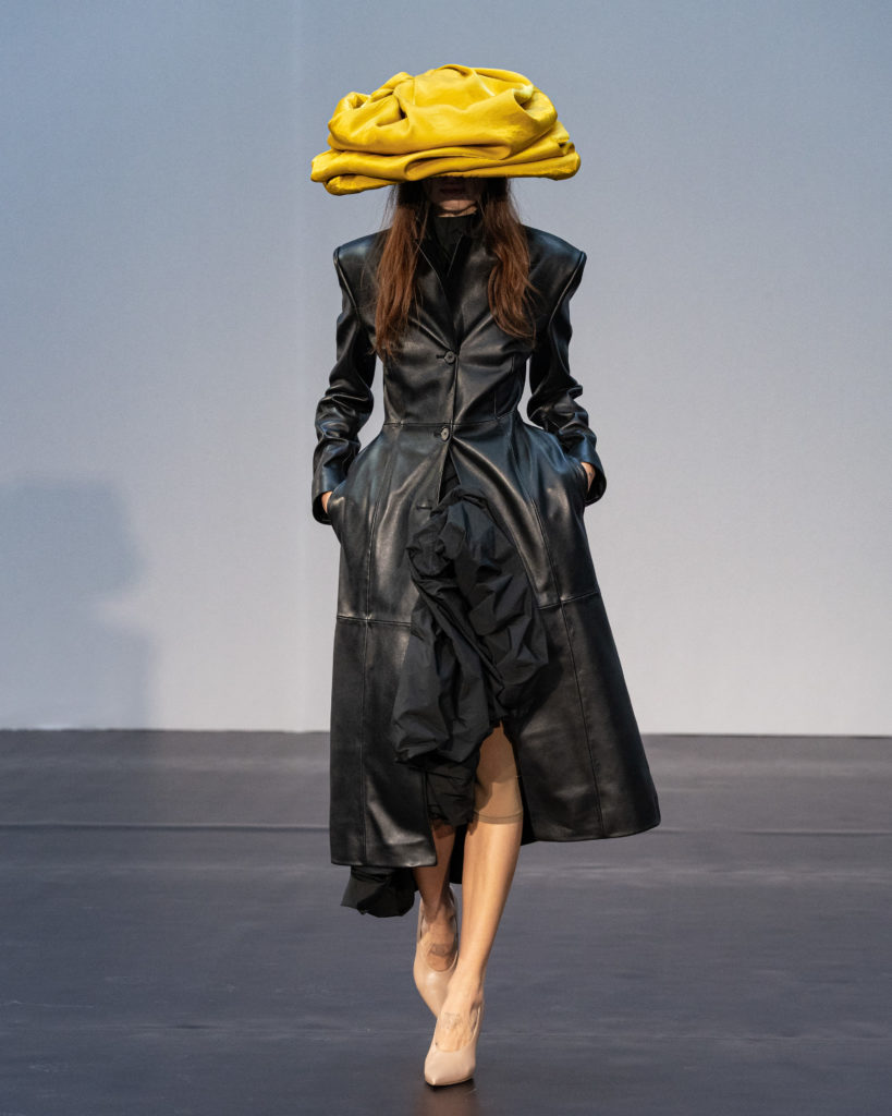 Elle a, à plusieurs reprises, convaincu Beyoncé, qui n’hésite jamais à faire appel aux talents de la finaliste du prix LVMH lorsqu’elle recherche un look romantico-sexy. C’est désormais l’industrie de la mode que Magda Butrym séduit, en offrant un pan intime de ses inspirations. Après avoir plongé dans ses souvenirs d’enfance lors de sa première présentation parisienne en 2024, la créatrice polonaise dévoile son défilé The Studio. Cette collection Printemps-été 2026, transforme l’atelier de Magda Butrym, à Varsovie, en hommage vivant. Un hommage aussi à l’artiste polonaise Paulina Olowska et à son exposition Windows of the Wind, dernièrement présenté à Genève. Ce qui donne en tout premier lieu naissance à des chapeaux oversized, drapés, en jaune moutarde, en blanc écru ou en noir encre. Ils s’ouvrent autour des visages comme des roses majestueuses. Les mannequins voguent la tête dans les nuages, mais concentrées. C’est le ton de la collection.