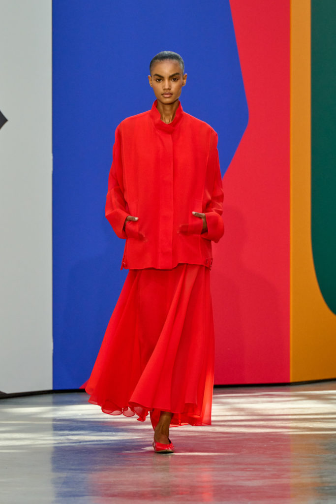 Certaines silhouettes de la collection printemps-été 2026 d’Akris, à l’image du tailleur orange feu et de l’ensemble rouge écarlate, rappellent des idées, des structures, déjà explorées dans la collection printemps-été 2025. La main est sûre, la coupe irréprochable, mais l’effet de déjà-vu limite parfois la portée du propos. Là où l’œil attendrait un nouvel élan, le geste se répète, comme retenu par sa propre perfection.