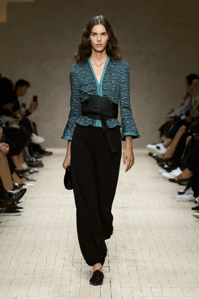 Armani est l’une des rares maisons à envoyer ses mannequins défiler avec le sourire. Ici, la femme n’est pas là pour être « cool » ou branchée, mais pour incarner la dolce vita et sa version sportive de l’élégance. Traduite dans la ligne accessible Emporio, la collection Printemps-Été 2026 propose des silhouettes ajustées, pantalons fluides et tops amples mais jamais oversize.
