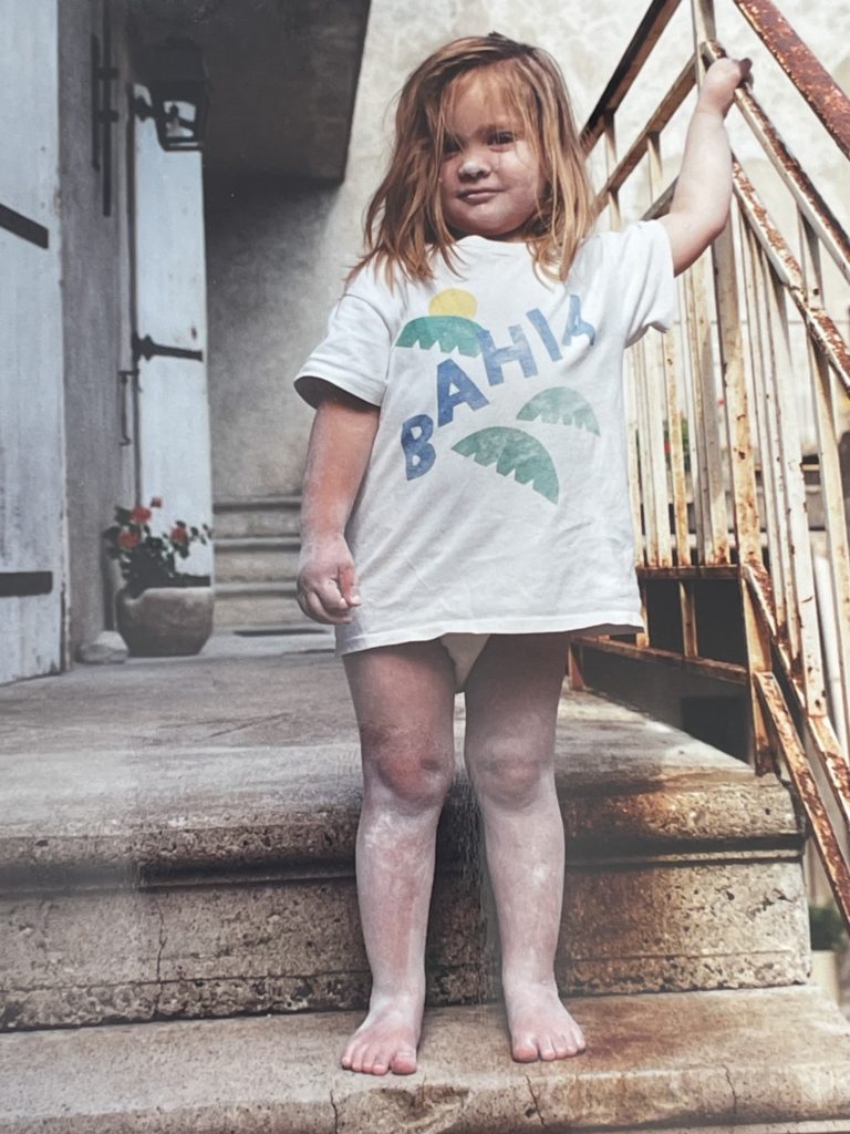 « Sur cette photo, j’ai deux ans et je suis en vacances chez mes grands-parents en Ardèche. Je porterais encore aujourd’hui ce t-shirt Bahia que je trouve très cool. Je m’étais mis du talc de la tête aux pieds. Quand mon père m’a vue, il m’a demandé ce que j’avais fait et je lui avais répondu : « Bah, de la peinture ! »