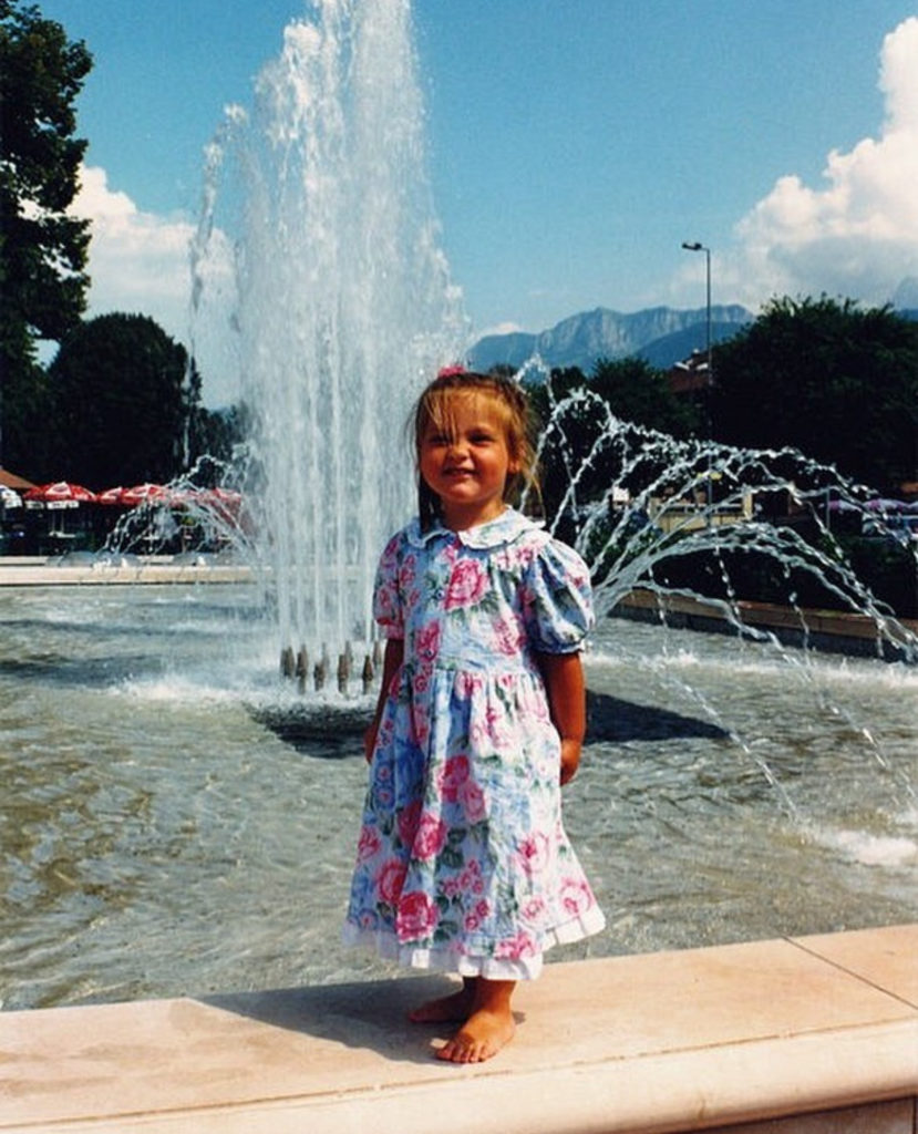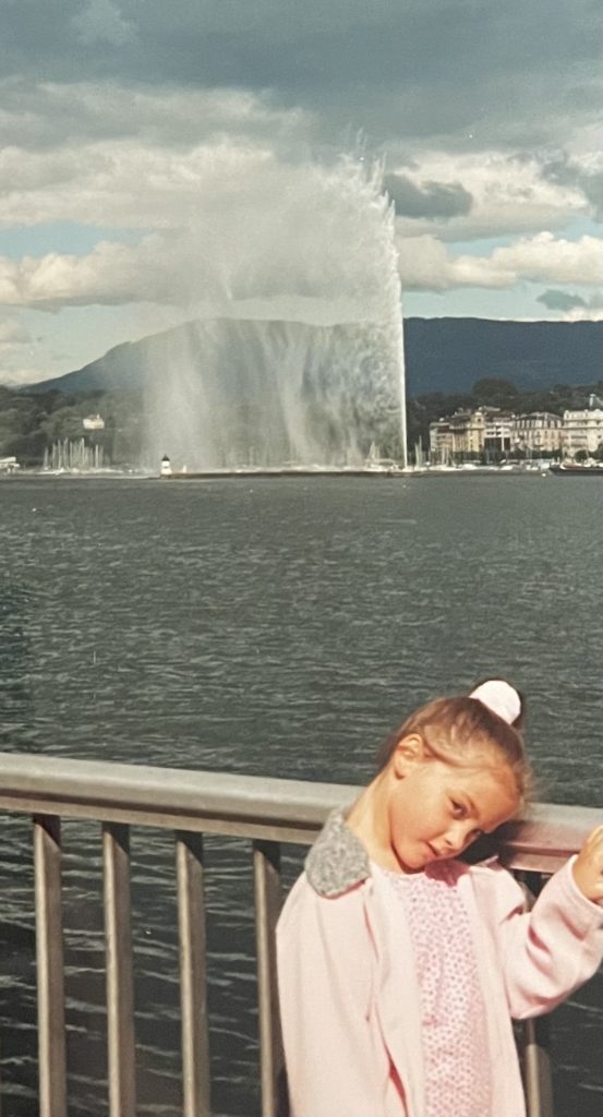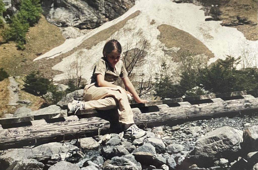 « Ici j’ai 9 ans et j’ai un doigt dans le plâtre dans un total look d’aventurière du dimanche. C’est non loin de Samoëns en France voisine. »