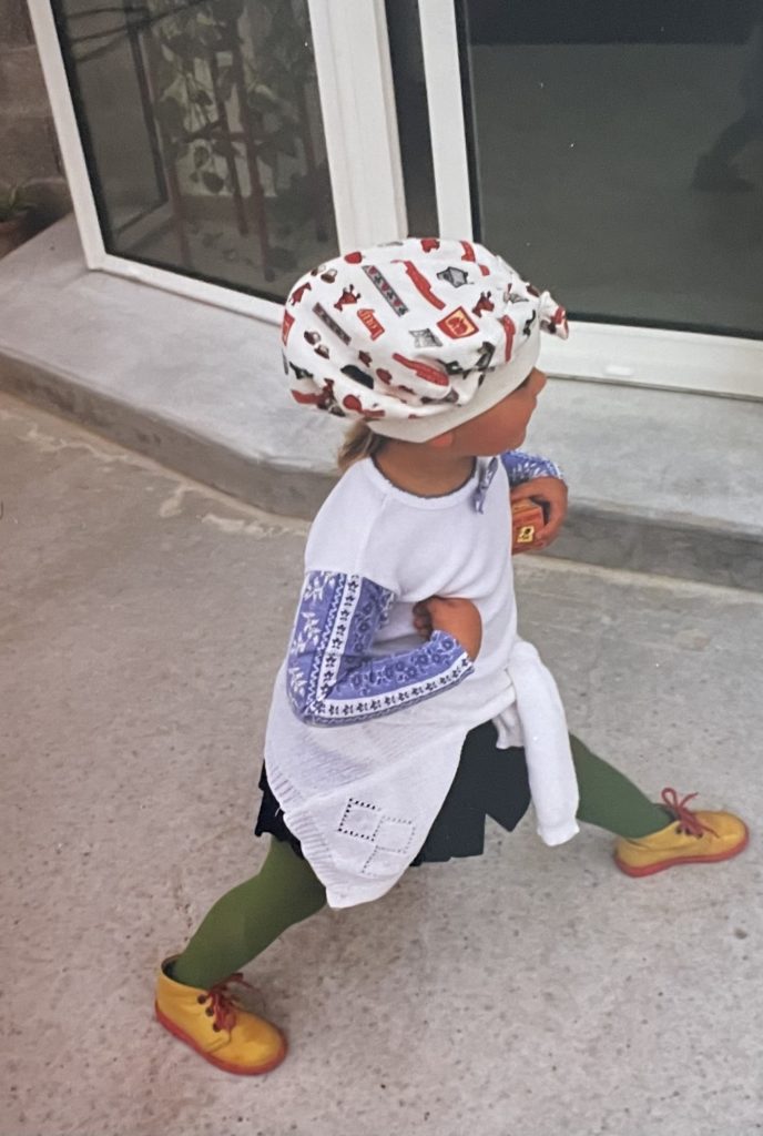 « On se promenait avec mes grands-parents à Genève. J’en ai une autre avec un cerceau, très star. Ils aimaient bien créer des petits looks comme ça, visiblement j’aimais bien ça aussi. J’adorais ce haut, j’avais le pantalon qui allait avec. J’aimais me déguiser et je me souviens que quand ma tante partait en voyage quelque part, elle me ramenait toujours un vêtement traditionnel pour enfant et ma grand-mère me faisait des jupes en tulle. J’adorais ça ! »