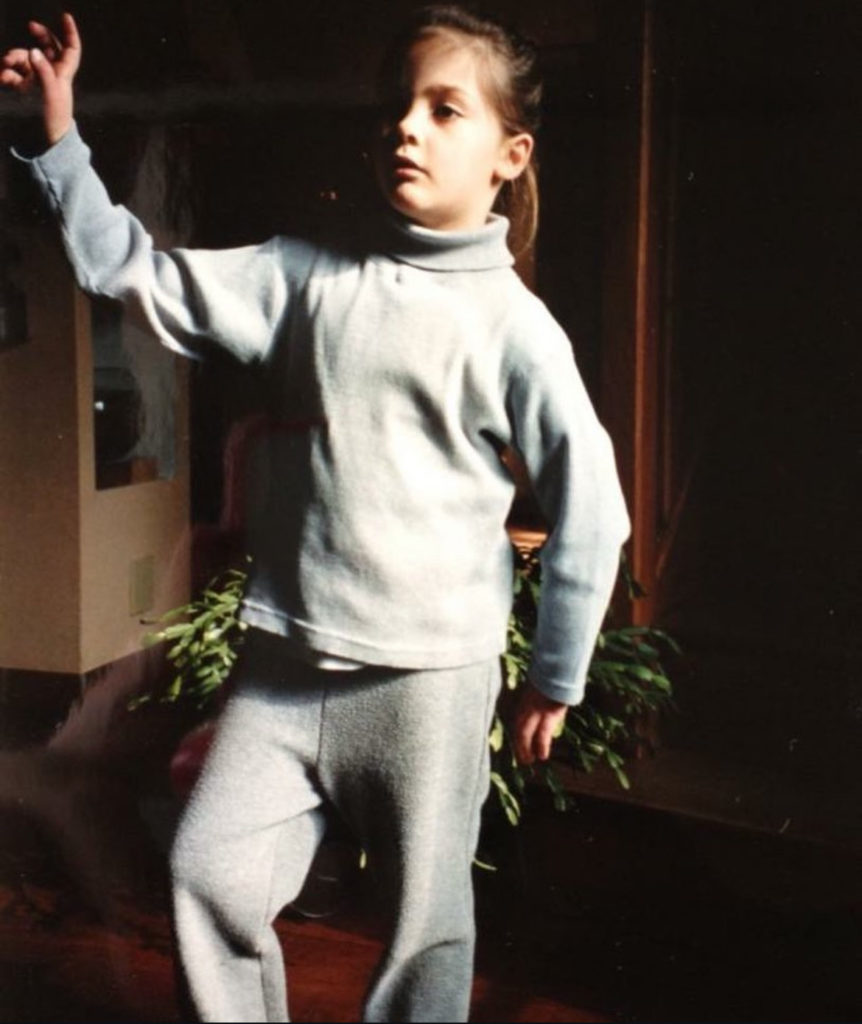 « Je dois avoir 6 ans sur cette photo chez mes grands-parents. C’était Noël. J’ai beaucoup de chance, parce que ma mère adorait faire des photos en argentique avec moi, j’ai plein de beaux souvenirs. Elle me demandait toujours de poser et je finissais toujours par inventer de nouvelles poses. Ici, j’imagine que ça devait être la statue qui commande un café au bar. »