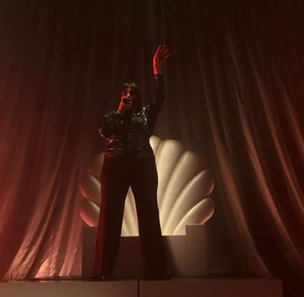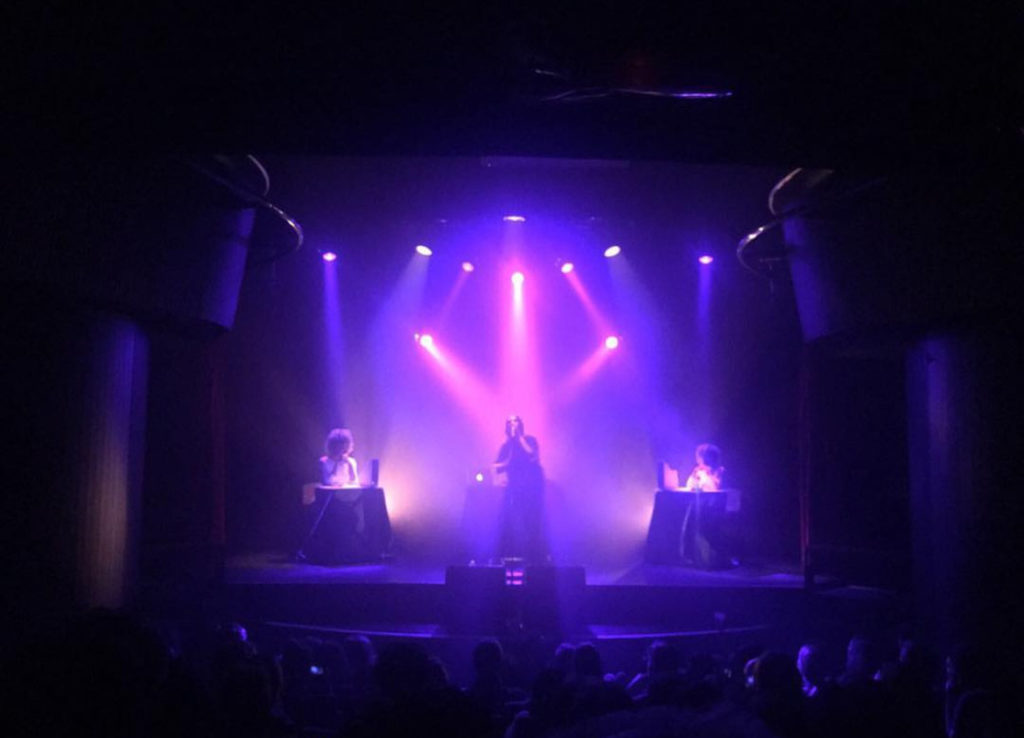 « Mon tout premier concert aux Trois Baudets à Paris en 2016. J’étais très stressée, mais j’en garde un très bon souvenir. J’étais accompagnée de deux danseuses, dont Dorine (à droite), qui m’avait accompagnée durant toute la première tournée. J’avais imaginé une scénographie où elles dansaient comme des secrétaires au bureau, avec des vieux téléphones et des minitels. C’était fait de bric et de broc, mais ça racontait déjà une histoire. »