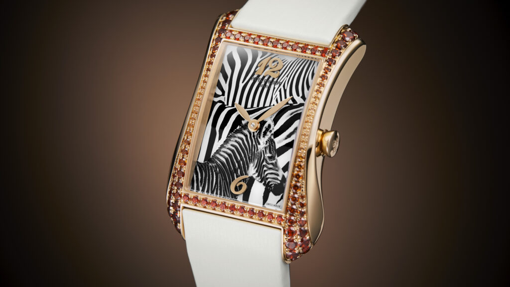 Deux ans plus tard, elle faisait un retour remarqué : boîtier en or rose, cadran laqué brun, spessartites flamboyantes. Une renaissance tout en subtilité. Patek Philippe en dévoile aujourd’hui une variation encore plus envoûtante. Le décor « Zèbres » s’inspire d’une pièce d’exception, la Golden Ellipse en émail cloisonné présentée dans la collection Haut Artisanat 2022. Pour recréer la vibration visuelle des rayures et la profondeur du motif, les artisans de la manufacture ont mis au point une technique d’une précision fascinante : un cadran en verre saphir gravé et encré sur les deux faces, complété par une métallisation noire et un vernis blanc apposés au revers. Résultat : un jeu visuel captivant, un relief presque vivant, comme si l’animal s’éveillait sous la surface.