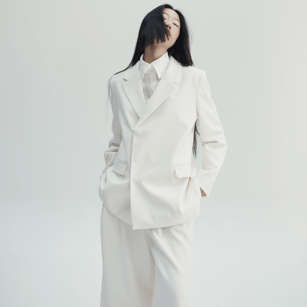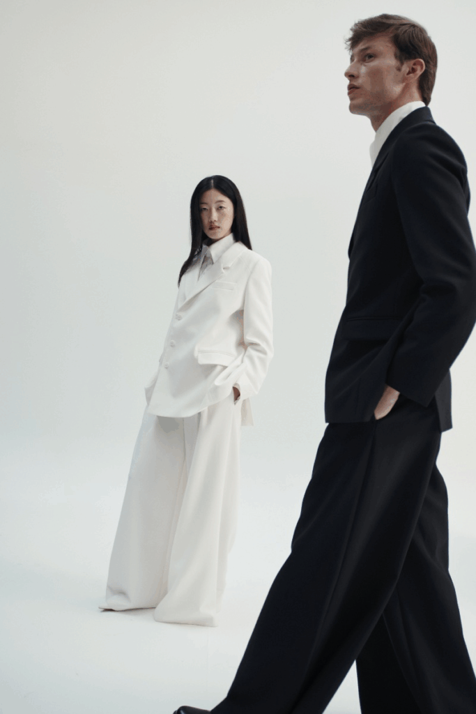 D’apparence classique, la chemise blanc révèle un jeu de construction plein de finesse. La fente sculpturale sur le flanc crée un dialogue discret entre structure et mouvement. Subtilement transparente, la pièce se porte comme un clin d’œil à l’intimité : le vêtement ne cherche pas nécessairement à séduire, mais à affirmer une silhouette respirante, libre. Autre must du vestiaire Alan Clerc x La Redoute : les tailleurs, qui s’imposent avec une présence quasi cinématographique. Les vestes, impeccablement taillées, allongent le buste tout en conservant une douceur dans les épaules. Les pantalons – amples, dramatiques, volontairement surdimensionnés – transforment quant à eux la démarche en statement mode.