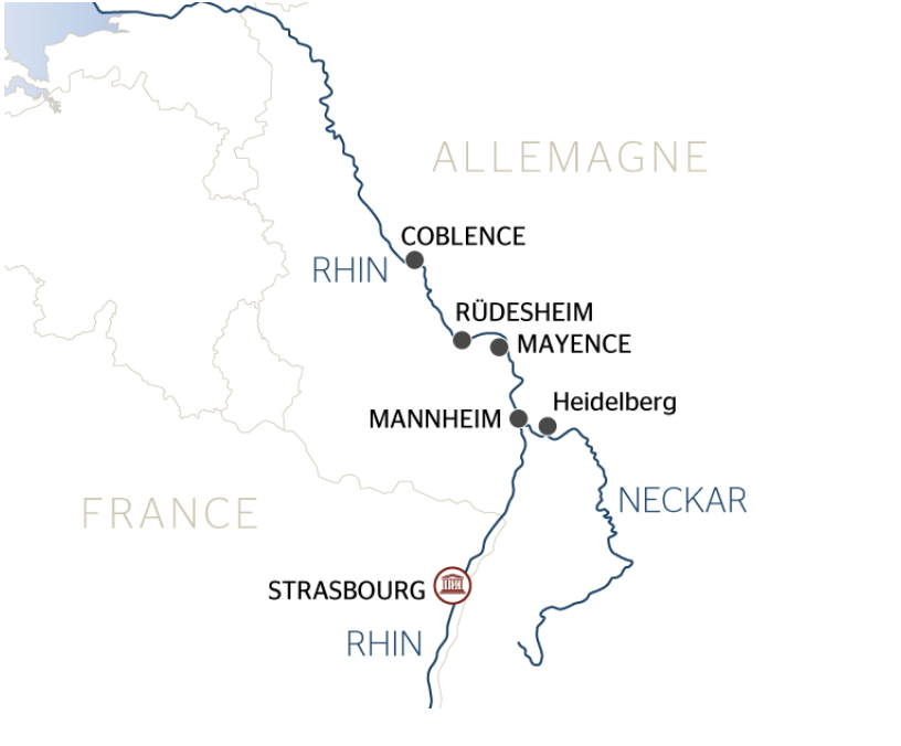 Le lendemain, la croisière met le cap sur Spire ou Mannheim. À bord, une conférence évoque les récits du Rhin. L’excursion à Heidelberg révèle le château de grès rouge, la vieille université et les traditions étudiantes, ponctuées d’un « Studentenkuss ». En soirée, le dîner de gala réunit les passagers avant l’arrivée à Strasbourg au petit matin, où le voyage s’achève dans une douceur qui reste en mémoire.