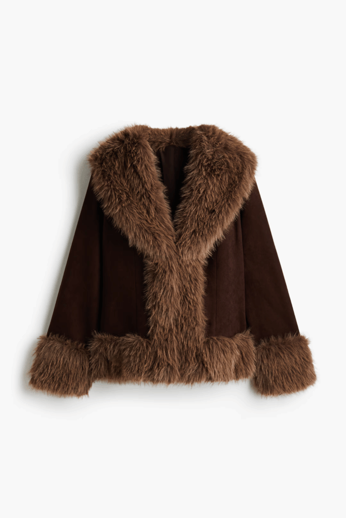 Parfois, tout ce dont vous avez besoin pour vous sentir dans l’esprit de l’hiver, c’est d’un petit clin d’œil à la fausse fourrure, ici sous la forme d’un col amusant et effiloché.
