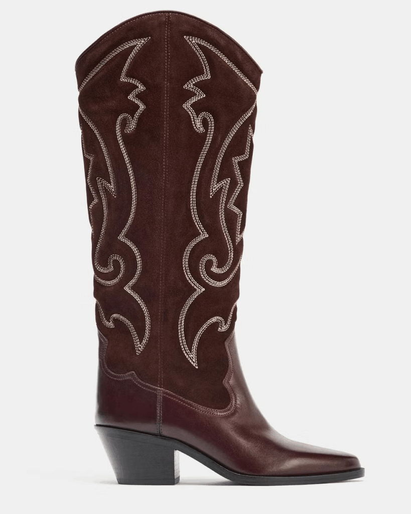 Les bottes d’inspiration western se parent cette année de formes plus soignées, réinterprétant leurs racines rodéo à travers des jeux de textures entre cuir lisse et suède.