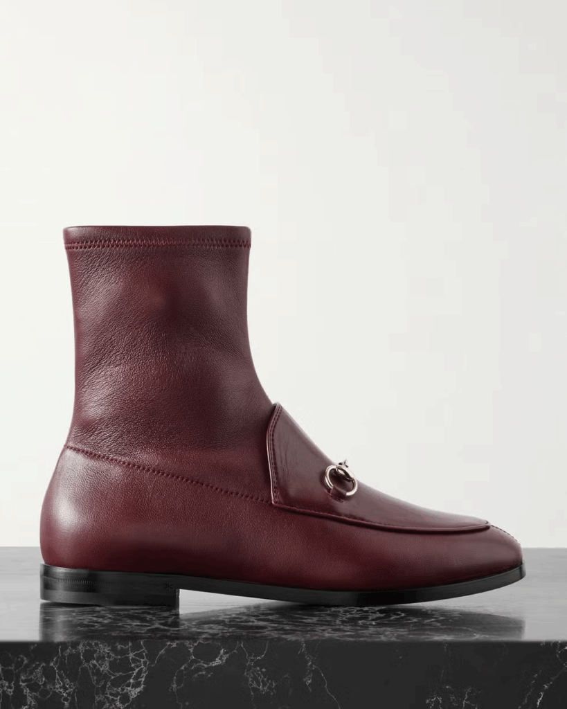 Le modèle hybride entre mocassin et botte — l’une des silhouettes les plus inattendues de l’automne-hiver 2025 — se décline en Anroca Red chez Gucci.