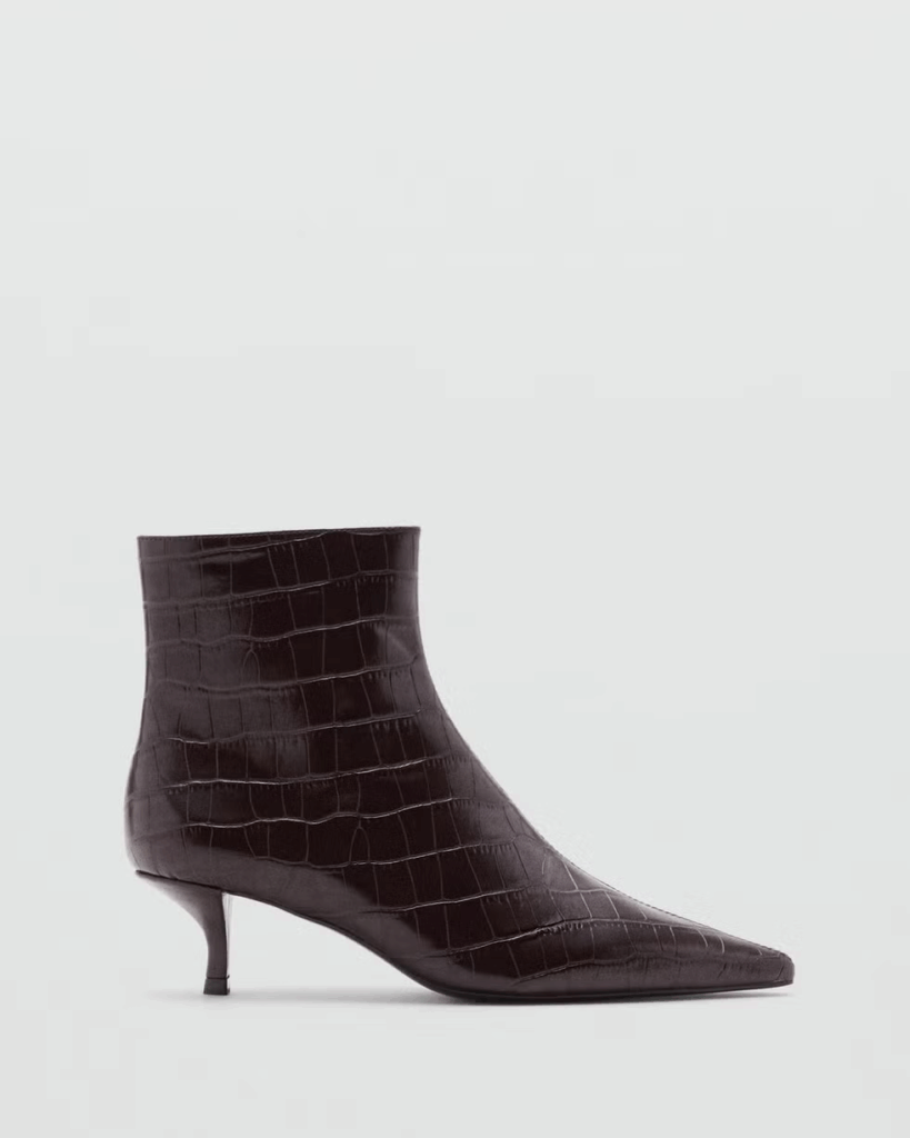Idéales sous un pantalon habillé ou un jean décontracté, les bottines en cuir effet croco à talon kitten de Mango allient élégance et confort au quotidien.