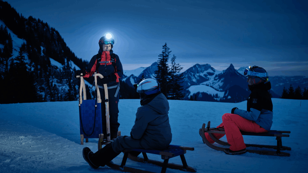 En janvier, les vendredis soirs à Charmey se transforment en aventures grâce à une super activité à faire en solo ou en groupe : la luge nocturne. Après avoir admiré le spectacle du coucher de soleil sur la région de la Gruyère, à Fribourg, il suffira d’allumer sa lampe frontale pour une descente inoubliable de 4 kilomètres sous les étoiles. Que l’on ait sa propre luge ou que l’on en loue une sur place, l’ambiance ludique alternera avec des moments de découverte du paysage, entre alpages et forêts enneigées. À ne surtout pas manquer : le Restaurant Les Dents-Vertes, à 1626 m d’altitude, pour tous les visiteurs qui auront envie de se réchauffer avec une pause gourmande au sommet de Vounetz.