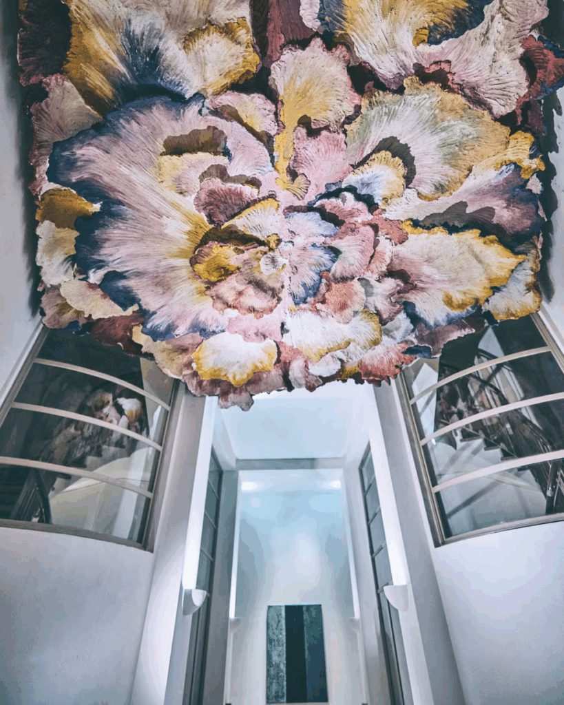 Dès l’entrée, l’expérience muséale s’amorce avec une fresque tridimensionnelle signée Edoardo Piermattei, qui habille le plafond voûté. Ses interventions in situ sont façonnées à la main en béton, conférant au lieu une dimension à la fois brute et sculpturale.