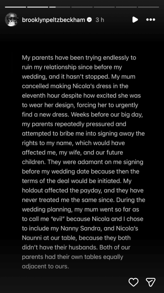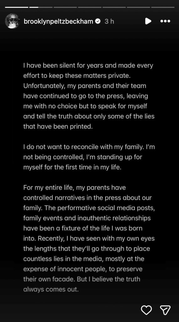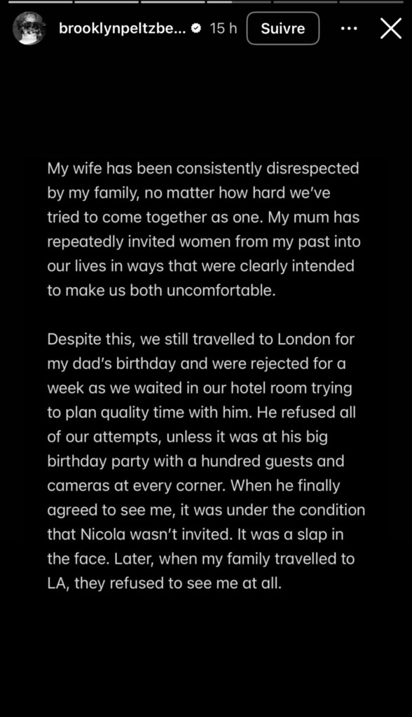 Brooklyn Beckham a choisi de rompre le silence maintenant sur la querelle familiale qui oppose actuellement les Beckham , parce qu’il juge qu’après être « resté silencieux pendant des années » et avoir « tout fait » pour garder ces affaires privées, l’homme de 26 ans reproche à ses parents de diffuser dans la presse « des mensonges » – situation que ce dernier explique subir depuis son enfance et désormais vouloir mettre un terme « pour la première fois de sa vie ».