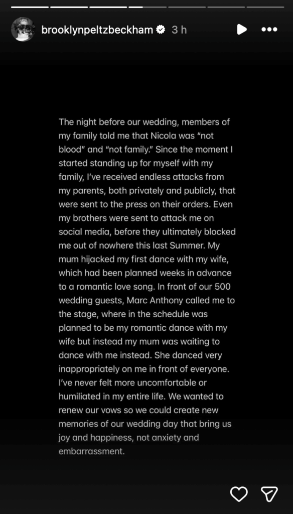 - Brooklyn Beckham affirme que sa mère aurait pris part à un moment qu’il considérait comme intime et symbolique de son mariage. Selon lui, la première danse, préparée avec son épouse sur une chanson romantique, aurait été modifiée le soir de la cérémonie. Il raconte qu’au moment où l’artiste Marc Anthony l’aurait appelé sur scène devant quelques 500 invités, sa mère serait intervenue pour danser avec lui à la place de son épouse. Brooklyn décrit cette danse comme ayant été, à ses yeux, « inappropriée » et vécue comme humiliante.
