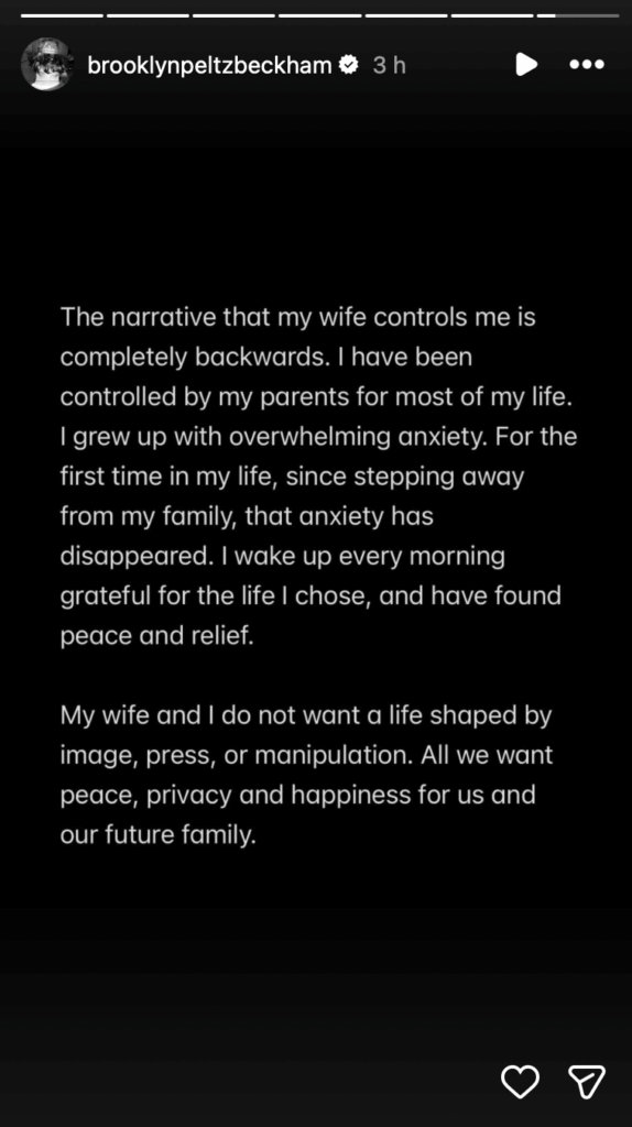 Pour rappel, depuis plusieurs années, la presse rapporte que des tensions existent au sein de la famille Beckham. Des sources ont évoqué des désaccords autour de la vie personnelle de Brooklyn, notamment sa relation avec Nicola Peltz et le mariage du couple en 2022, ainsi que des divergences sur la manière dont la famille présentait son image dans les médias. Certains articles ont suggéré que Brooklyn entretenait une distance croissante avec ses parents, notamment sur les réseaux sociaux, et que ses choix de vie étaient parfois perçus comme sources de friction.