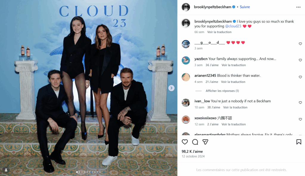Nombreux sont les internautes à avoir soutenu l’aîné de la famille dans sa quête de « paix » et de « vérité ». Néanmoins, d’autres ont déterré de nombreuses publications récentes dans lesquelles Brooklyn Backham s’affiche publiquement aux côtés de sa femme et de ses parents. L’une d’elles date du 12 octobre 2024 : on y voit notamment Brooklyn Beckham, Nicola Peltz, Victoria Beckham et David Becckham posant à l’inauguration de Cloud 23, la marque de sauce piquante lancée par Brooklyn Beckham.