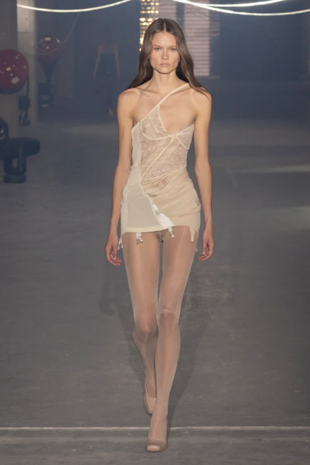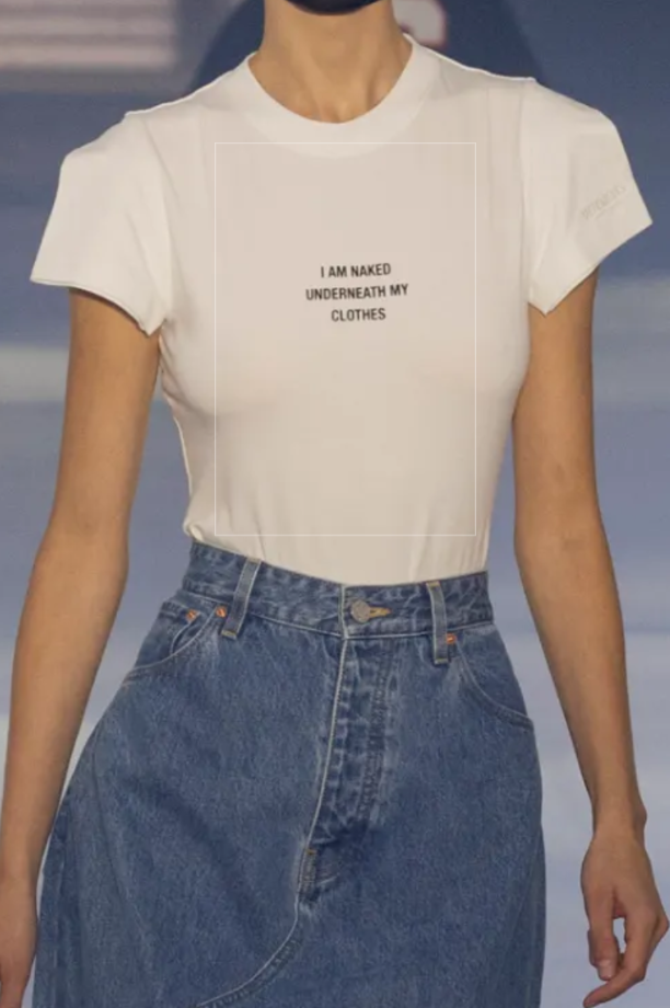 D’autres jupes fendues à l’arrière, révélant ostensiblement le fessier des mannequins, injectent une dose d’humour grinçant dans un outfit qui lui se clame rigoureux. Dans le même temps, un simple look doté d’une longue jupe en denim structurée et d’un T-shirt blanc banal, s’associe à un message : « Je suis nue sous mes vêtements ». Le banal devient politique. Et c’est là que réside la force du geste. Chez Vetements, le corps n’est pas idéalisé : il est exposé, sous toutes ses formes, en tout temps assumé.