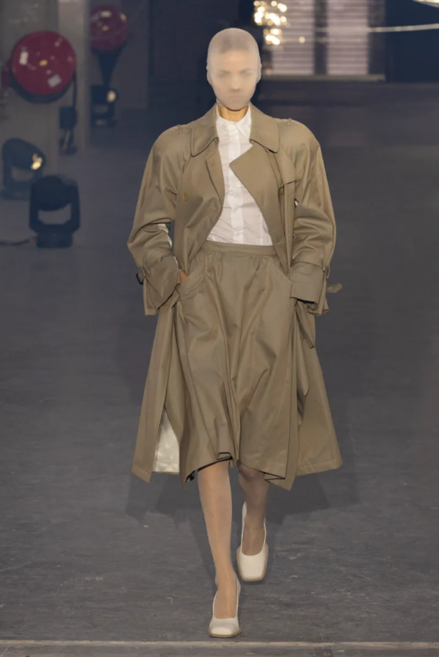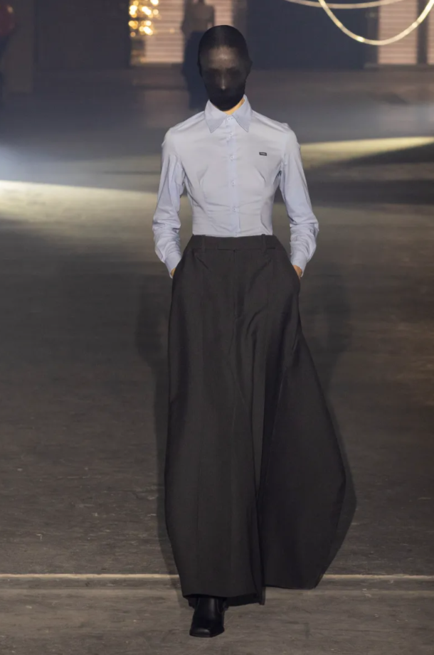 Tout au long du défilé, le choix du mannequin masqué se répète en boucle et agit comme un manifeste silencieux : la star n’est plus celle qui défile, mais bien le vêtement lui-même. Une prise de position forte à l’ère de l’hyper-personnalisation, où l’image et le visage dominent souvent le discours de mode. Ici, Vetements redonne au vêtement ses pleins pouvoirs.