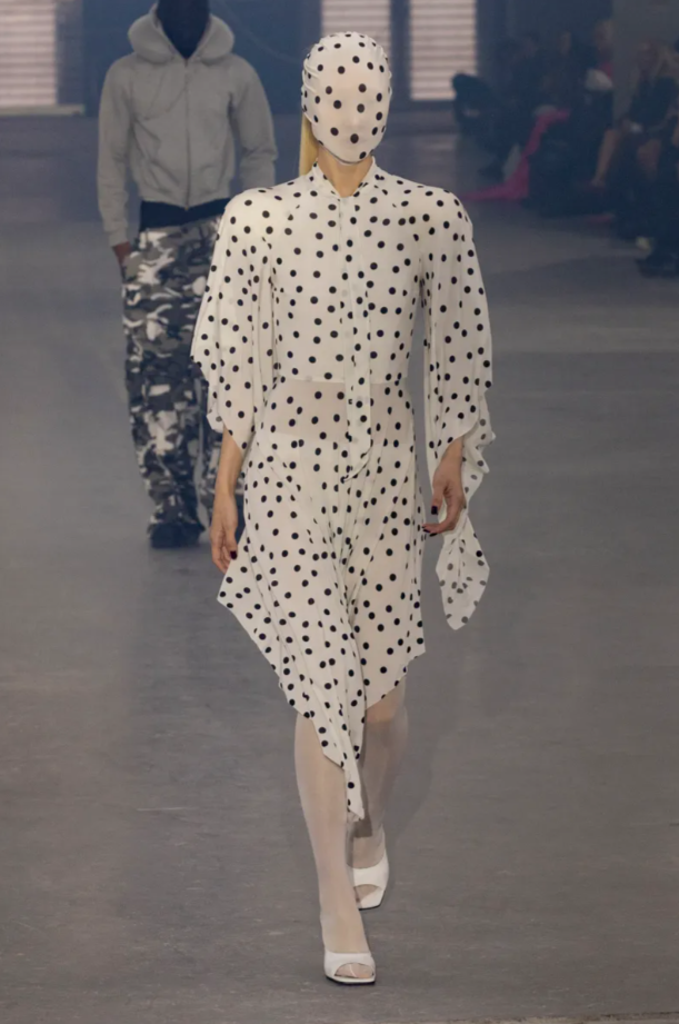 De Heidi Klum à Kelly Rutherford jusqu’à Bill Kaulitz ou encore Ming Lee Simons : un mot revenait sans cesse dans la bouche du front row : « subversif ». Et il ne s’agit pas ici d’un simple effet de style. La subversion chez Vetements est une grammaire. Elle s’exprime dans les volumes, les proportions, la manière de porter – ou de détourner – le vêtement. Une robe blanche aux pois noirs, fluide, presque aérienne, se déploie en mouvement, tout en comprimant le visage sous un masque intégral. Le corps avance libre, mais désincarné. Et ce n’est pas le seul look à offrir une pleine scène à cet accessoire perturbant.