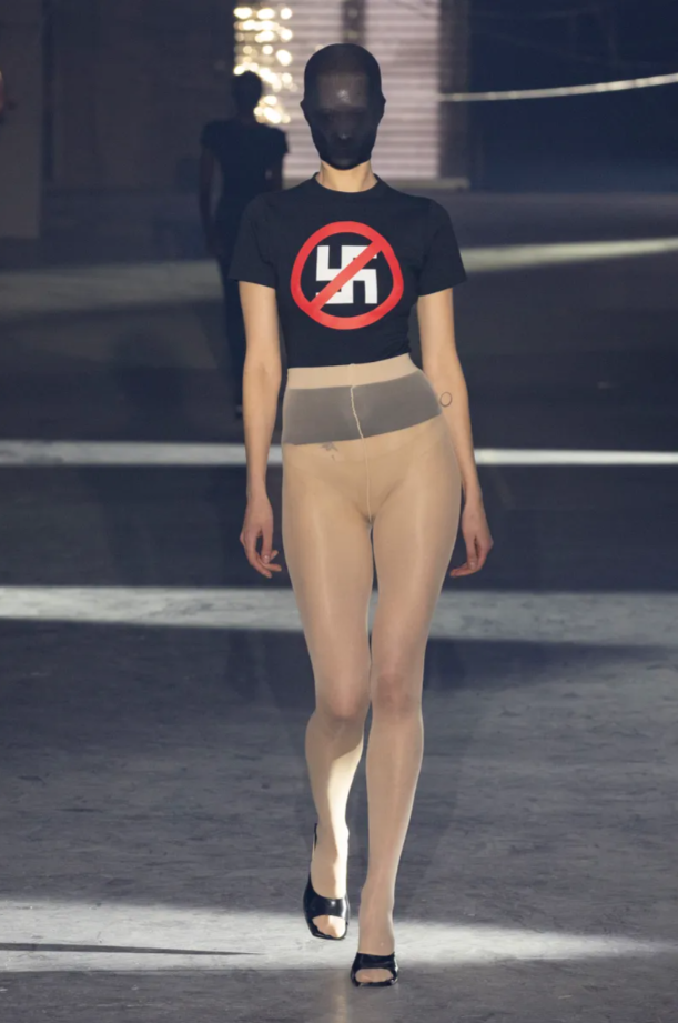 Pour cause, dans un contexte où la garde-robe printanière se veut traditionnellement légère, aérienne, presque rassurante, Vetements prend le contre-pied avec une proposition dense, expressive, ultra sombre. Dès le premier look et le premier son, on le comprend : de voraces aboiements accompagnent un tee-shirt affichant une croix gammée surplombée du sigle « interdit ». Brutal ? Perturbant ? Très probablement. Mais il ne faut pas longtemps avant de réaliser que cette collection ne cherche ni l’adhésion immédiate ni le consensus. Elle impose une vision : radicale, ironique, résolument contemporaine de la mode.