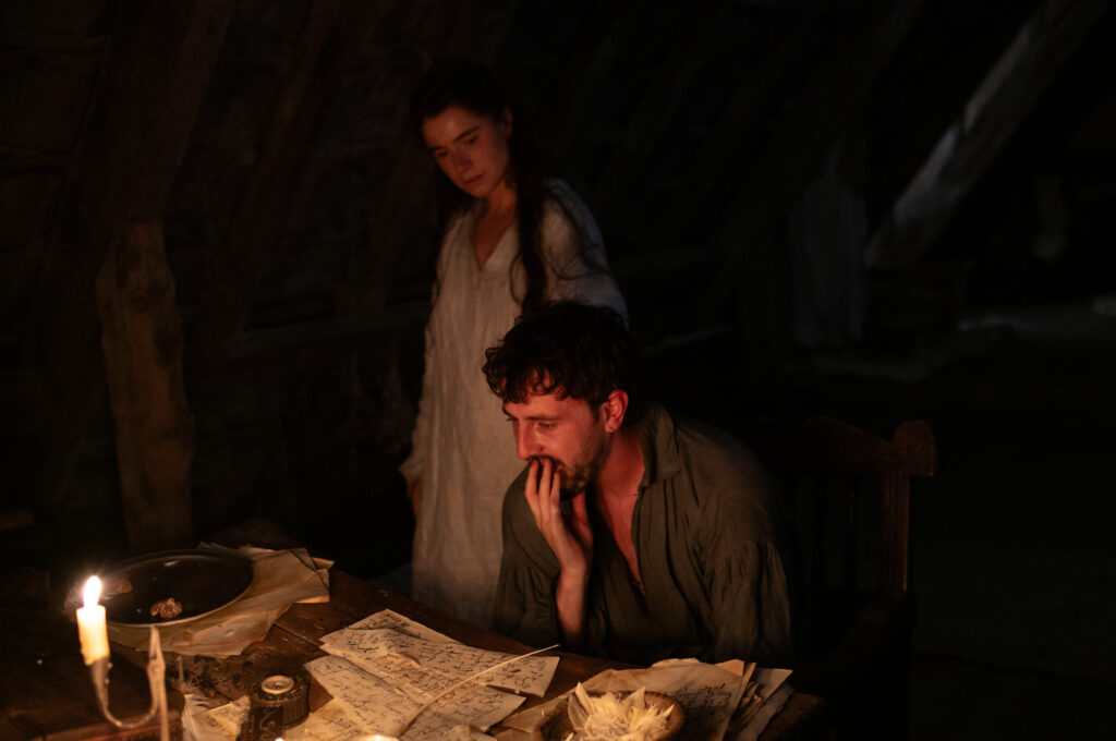 Hamnet s’ouvre sur un William Shakespeare encore inconnu, enfermé dans une existence trop étroite, contraint de travailler pour un père tyrannique. Sa rencontre avec Agnes, guérisseuse et diseuse d’avenir profondément liée à la nature, perçue comme une sorcière par les habitants du village, bouleverse son existence. Leur histoire d’amour bénéficie de la puissante alchimie entre Jessie Buckley et Paul Mescal, qui s’étaient déjà croisés au générique de The Lost Daughter (2021), mais sans y partager de scène.
