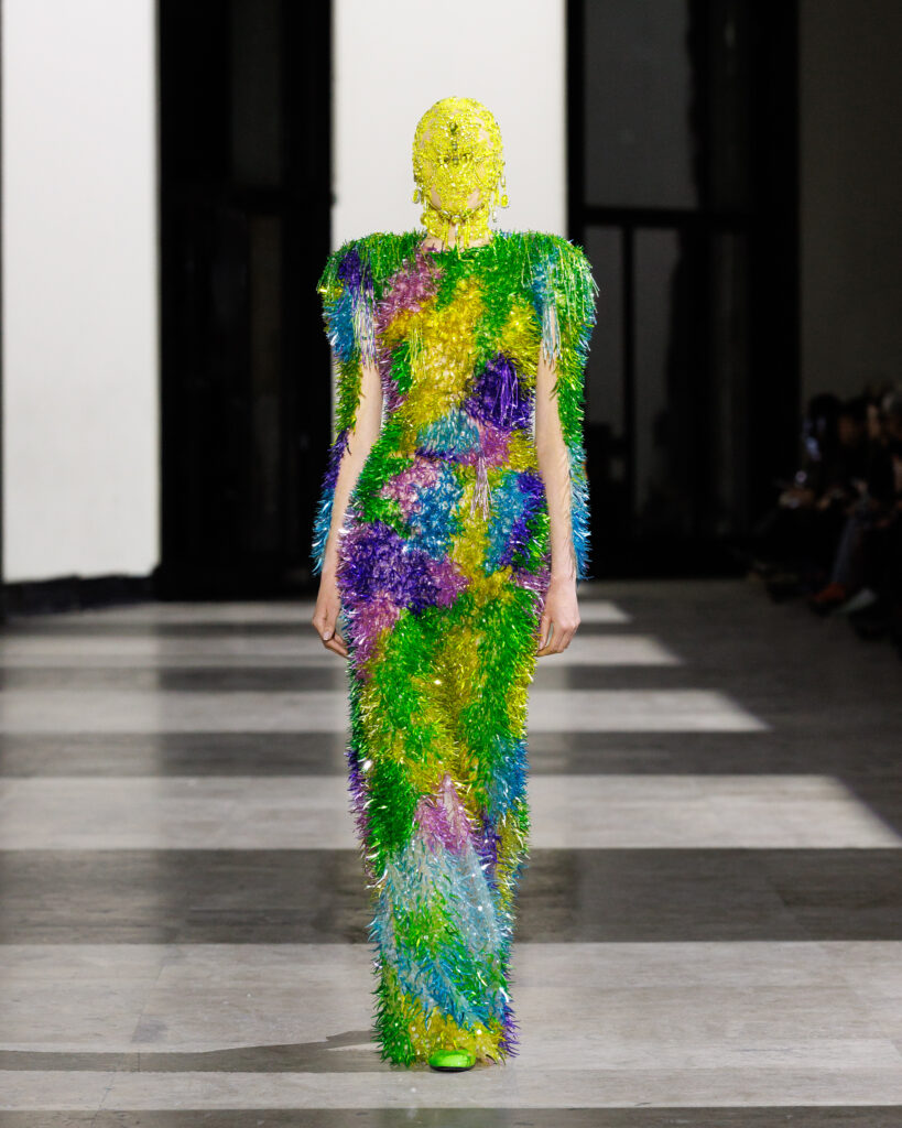 « Les chardonneuses », comme se nomme la collection, c’est exactement ça : intrigante, fascinante, avec des formes insensées, des couleurs incandescentes et des brillances si luminescentes qu’on oublie qu’elles viennent, au départ, de looks déjà dévoilés. Les 25 tenues qui ont défilé au Palais de Tokyo ont plus précisément été conçues à partir d’anciennes pièces de Maisons du groupe LVMH, allant jusqu’aux uniformes officiels de l’équipe de France pour les Jeux Olympiques et Paralympiques de Paris 2024 par Berluti.